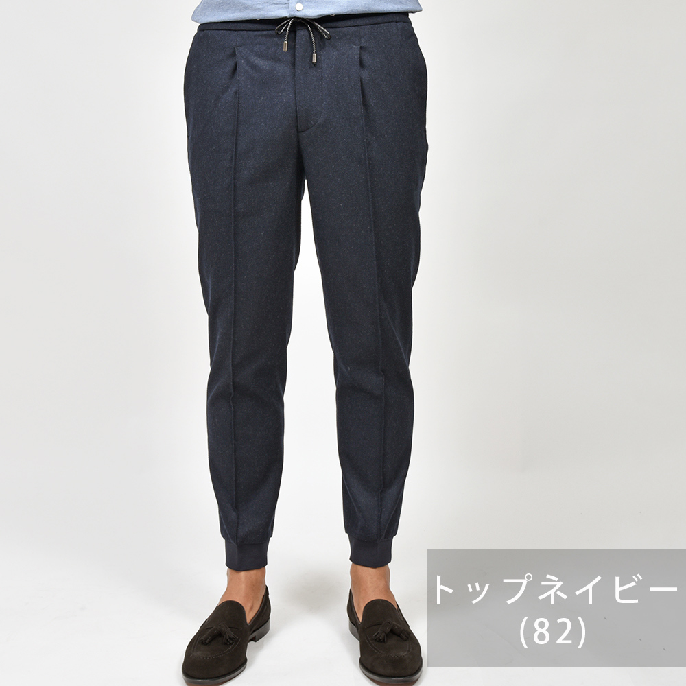 MASACCIO(マサッチョ)をベースに別注を行い、今なおヒットし続けるモンスターアイテム(当社比)、“ring(通称リングッチョ)”。こちらは別注第二弾となる、“RIB ring(リブリング)”になります。“ring(通称リングッチョ)”をベースとしたこちらは、ラグジュアリーな雰囲気が漂うイントレチャートのドローコードや、1プリーツとMASACCIOの代名詞である永久クリースはそのままに、裾をリブ仕様に仕上げました。また、マーベルト部分は“TIZIANO(ティッツィアーノ)”のベルトループなしのシャーリング仕様を採用したハイブリットな一品となっています。