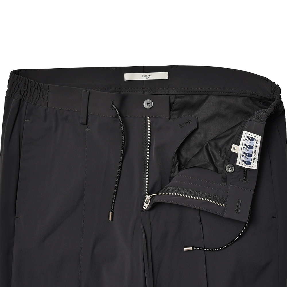 爆発的ヒットを記録したring初となるgiab's ARCHIVIO×ringの別注品、その名も“ring”。モデル名を決めかねていたバイヤー陣に対して、デザイナーの中新井氏の鶴の一声により決定した感慨深い一品です。そして、2020SSシーズンから“ring”をさらにアップデートした“ring2”が登場。1プリーツ入り“MASACCIO”のベースはそのままに、ドローコードをラグジュアリーな雰囲気が漂うイントレチャートに変更。さらに、マーベルトを-0.5cm幅を狭め、股上は+0.5cm深くすることでリラックス感が増しています。膝幅+0.5cmとそれぞれハーフサイズアップし、ふくらはぎの突っ張りを軽減しました。