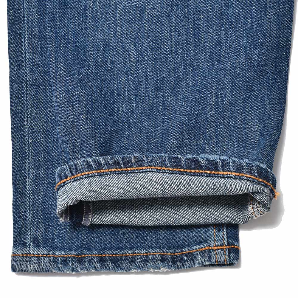 こちらは、しっかりとストレッチの効いたコットン主体のファブリック。青みを抑えたヴィンテージライクなウォッシュド加工を施し、さらにはダメージ&リペアを加えることで、シンプルなスタイルには欠かせない華やかさを宿しています。また、飴色で光沢のあるボタン&リベットに、オレンジ色のステッチ使いは味わいのある佇まい。高級感のあるスエードの革パッチが大人の色気を演出してくれます。