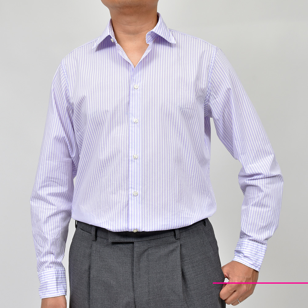 Lサイズがジャストサイズです。Mサイズだと身頃はスッキリとしていてややタイトめなシルエットなので、ゆとりを持たせて着用できるLを選択します。爽やかなロンドンストライプです!