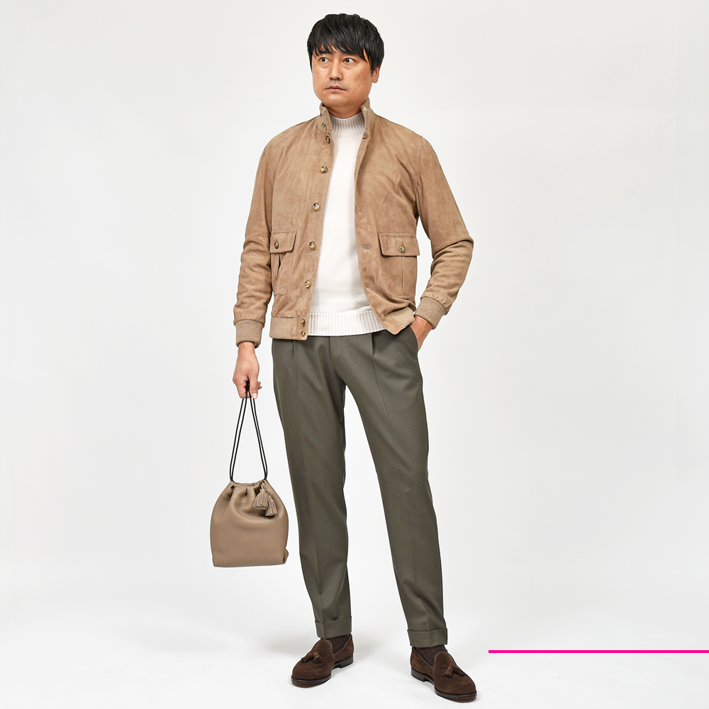 カジュアル使いは勿論ですが、少し緩めのシルエットのジャケットと合わせればオンタイムでも使用できる上品な生地感です。