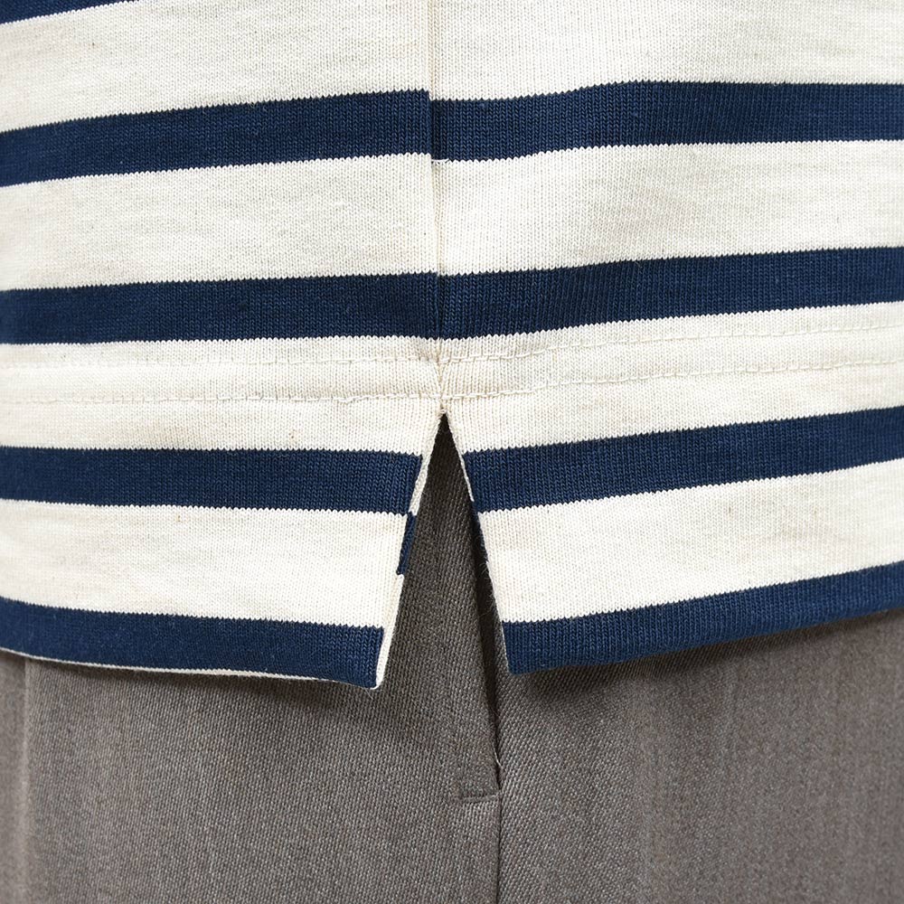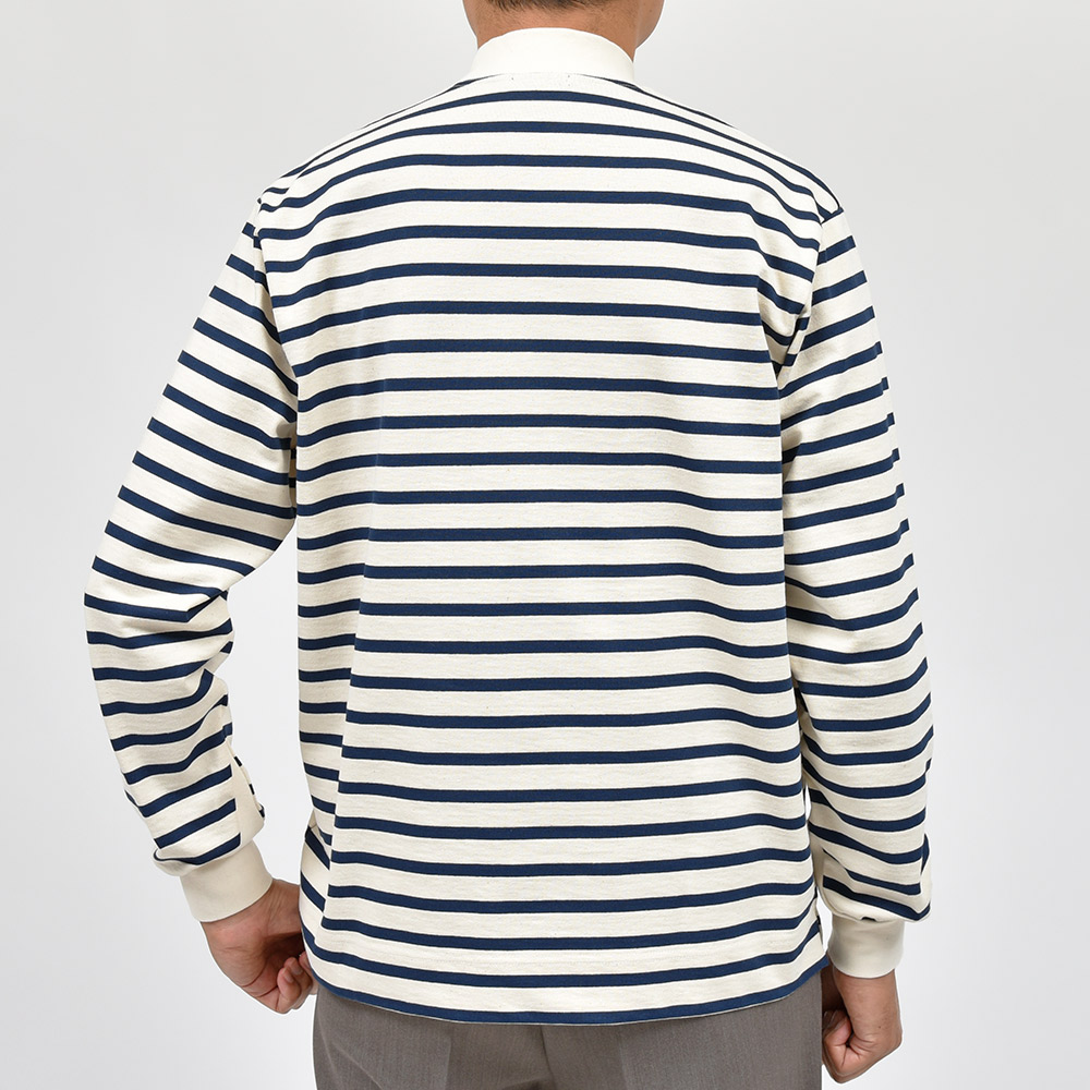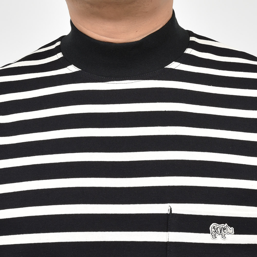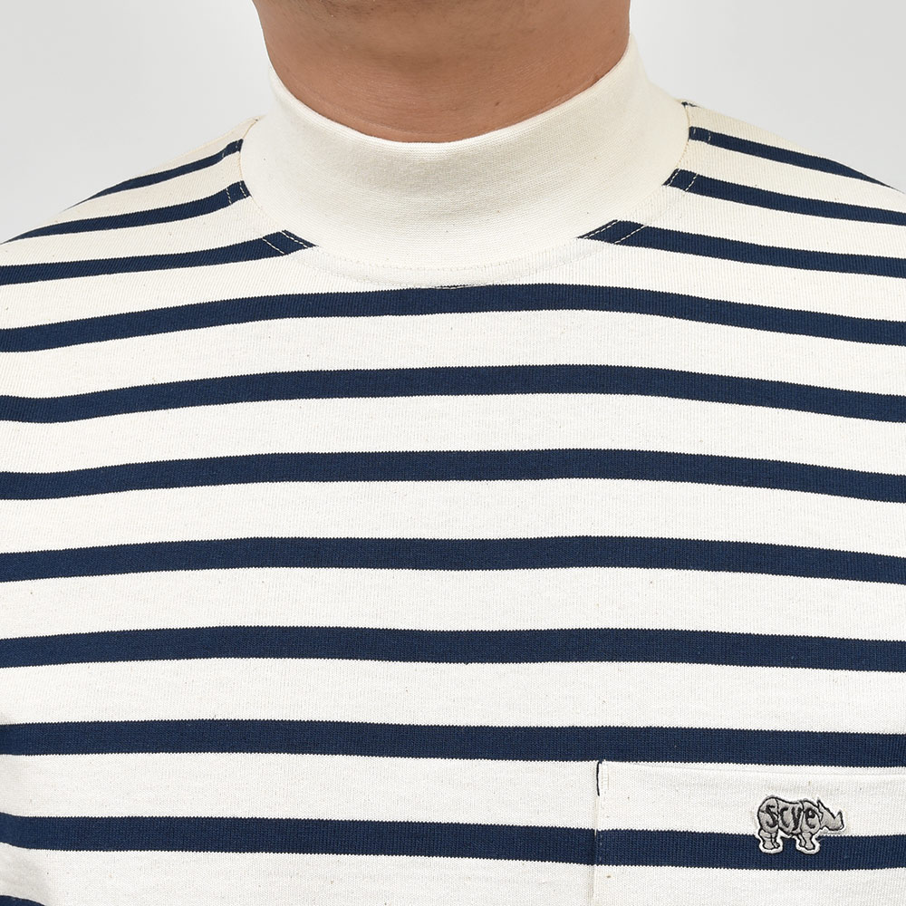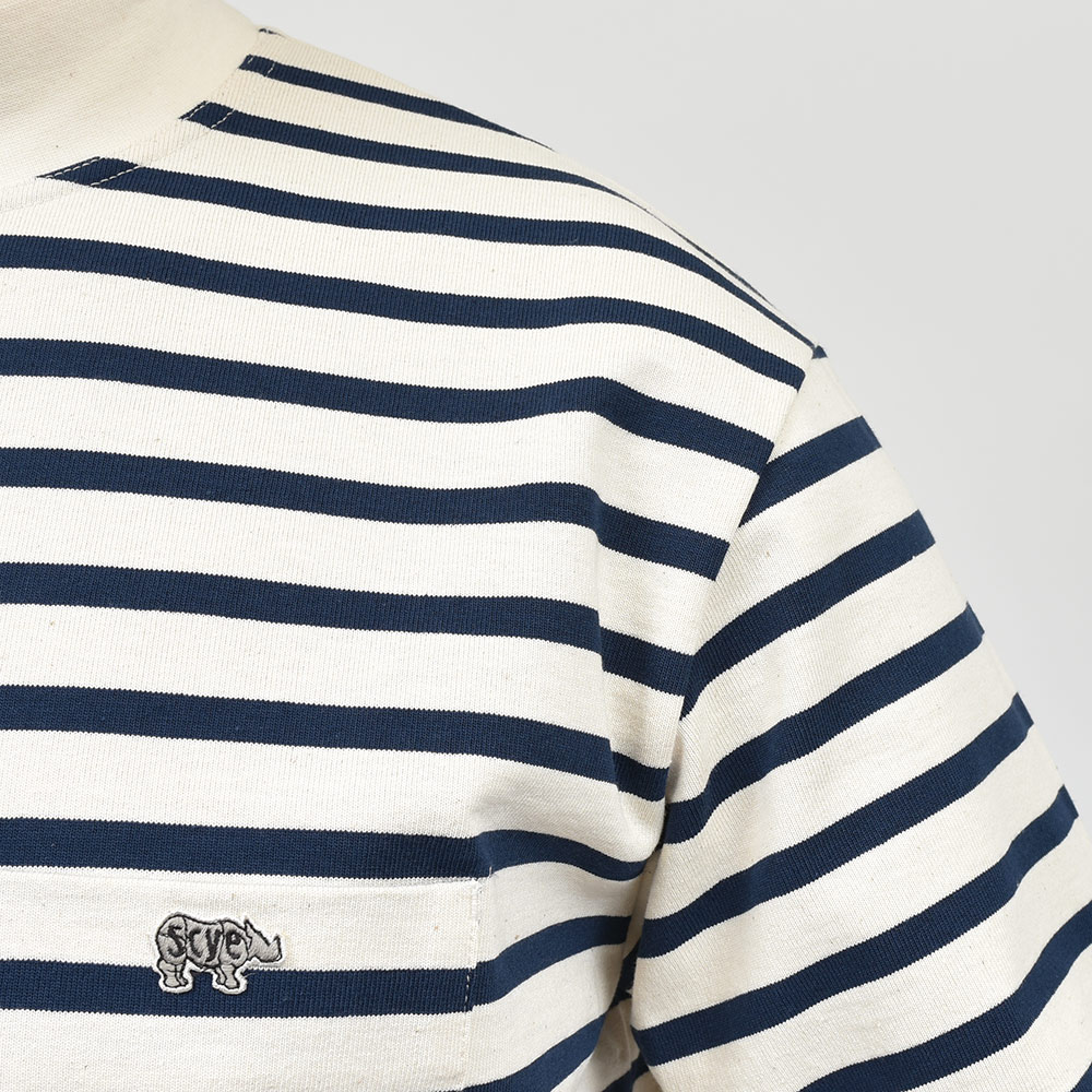 南フランスTOURNIER(トゥルニエ)社の16ゲージ度詰め天竺を使用したこちらは、薄すぎず厚すぎない程よい肉感が、夏以外の3シーズンで活躍してくれます。ボーダー柄と合わさることでバスクシャツのような雰囲気になりますが、モックネックが都会的な雰囲気を醸し出し、袖口の切り替えがSCYE BASICSらしい味のあるデザイン性。左胸には定番のサイのワッペンが付けられており、この適度な主張が大人のカジュアルスタイルには非常に良いアクセントとなっています。