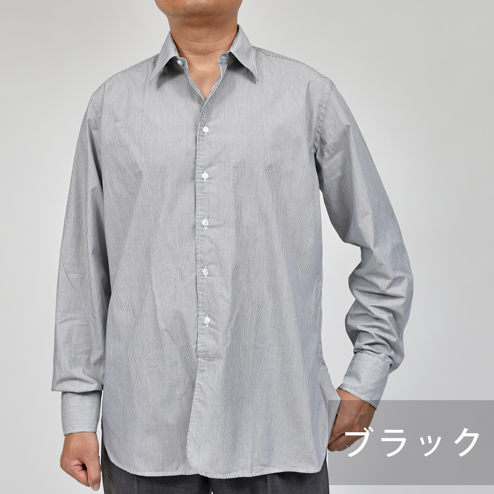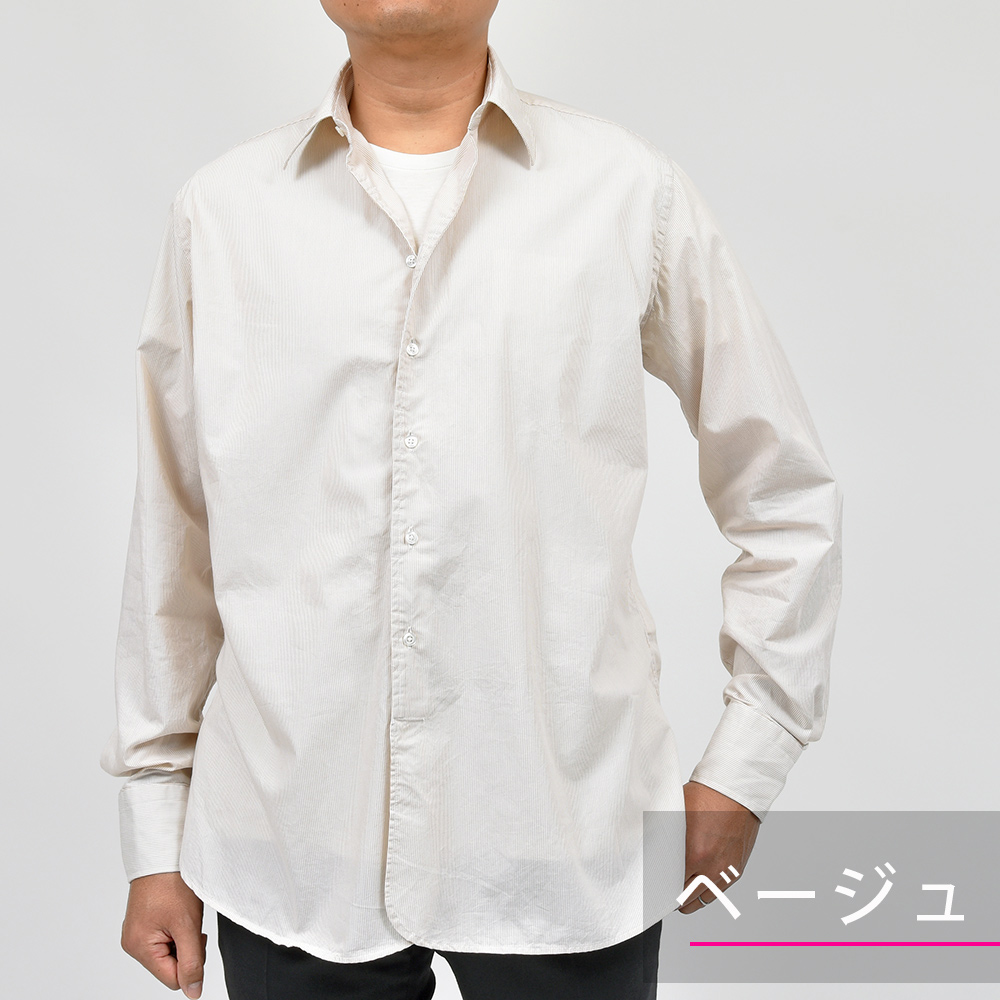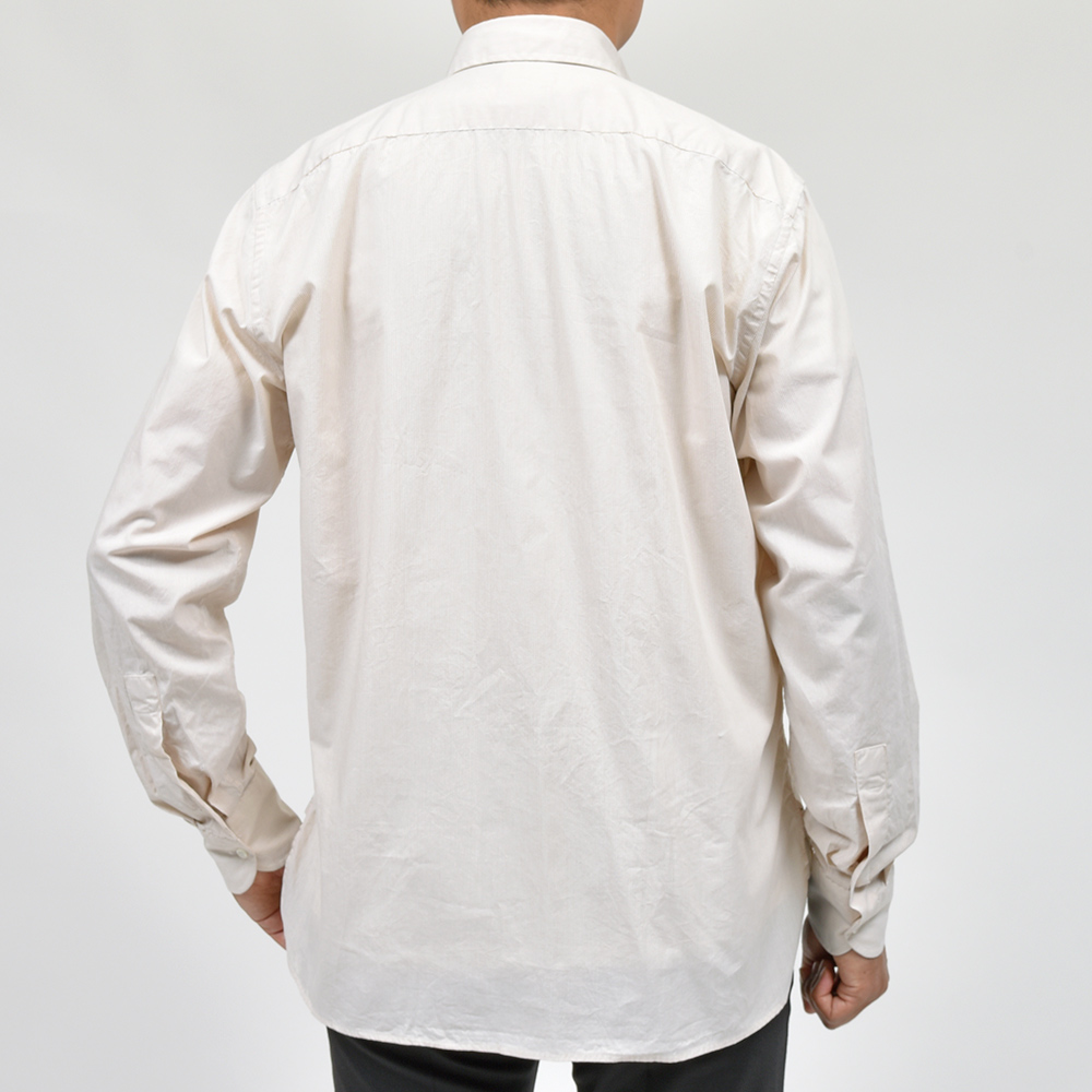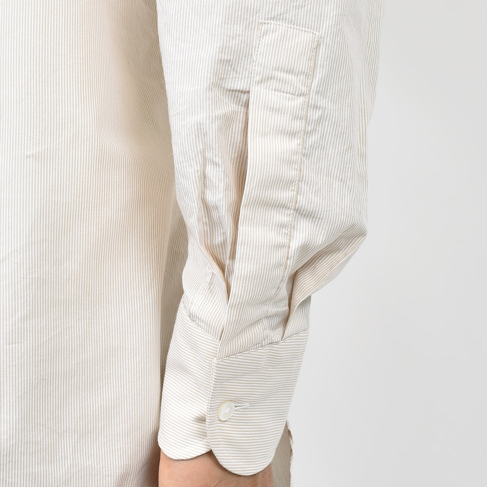 洗いを加えたコットン素材は、程よいハリ感がありつつも柔らかで薄手な生地感。細いピッチのロンドンストライプですので、ドレスというよりもカジュアルな雰囲気を醸し出します。一見するとキレイめなカジュアルシャツですが、裾の仕様やサイズ感でワークな味付けを施したインでもアウトでもサマになる一品です。