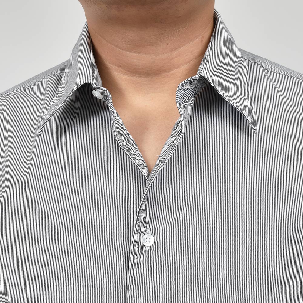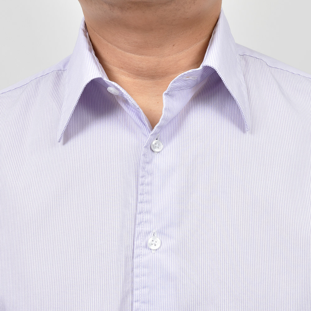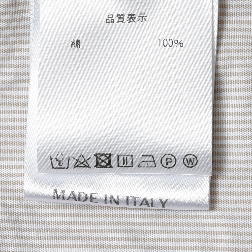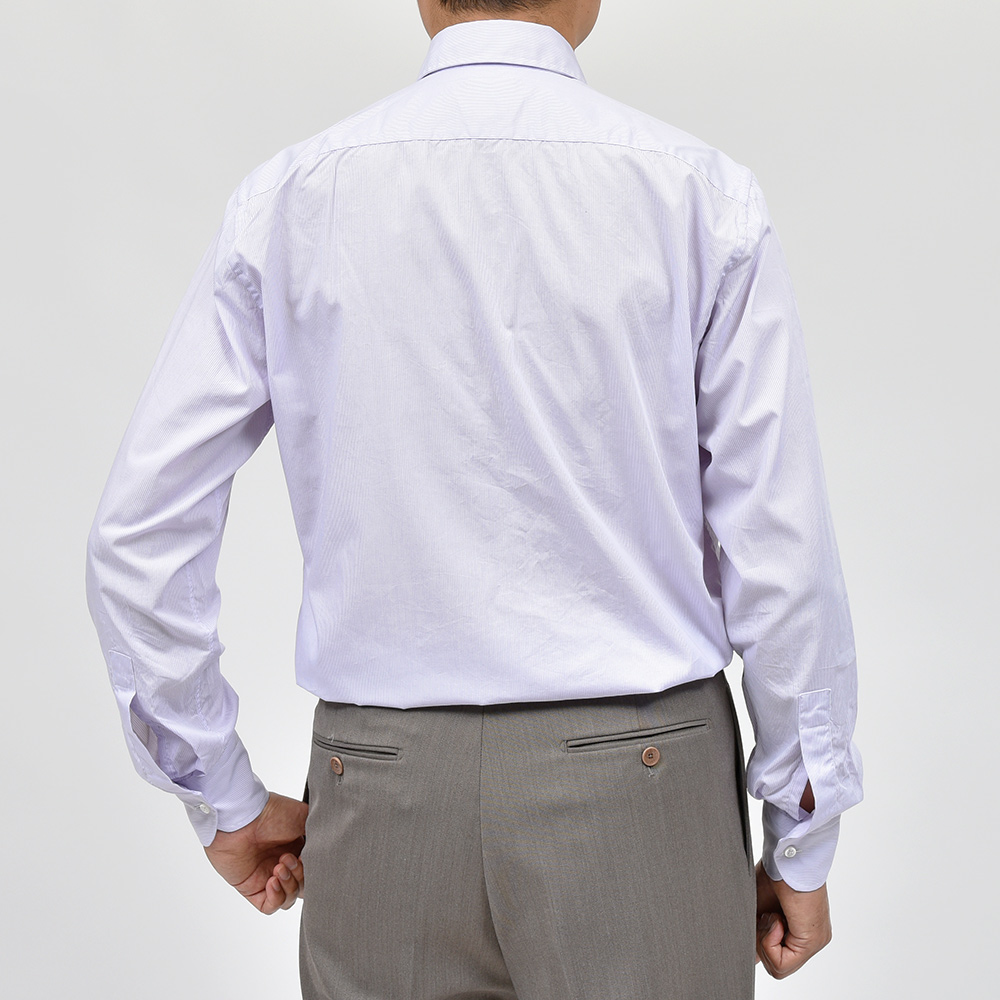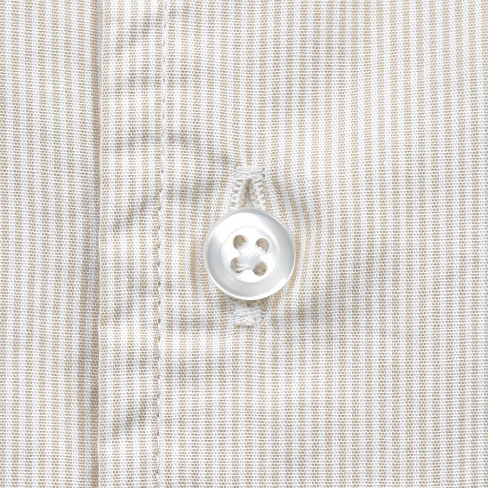 洗いを加えたコットン素材は、程よいハリ感がありつつも柔らかで薄手な生地感。細いピッチのロンドンストライプですので、ドレスというよりもカジュアルな雰囲気を醸し出します。一見するとキレイめなカジュアルシャツですが、裾の仕様やサイズ感でワークな味付けを施したインでもアウトでもサマになる一品です。