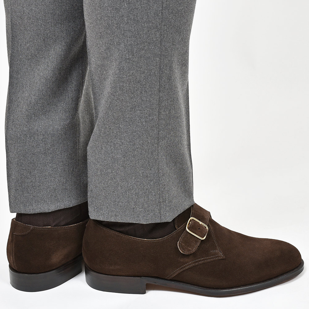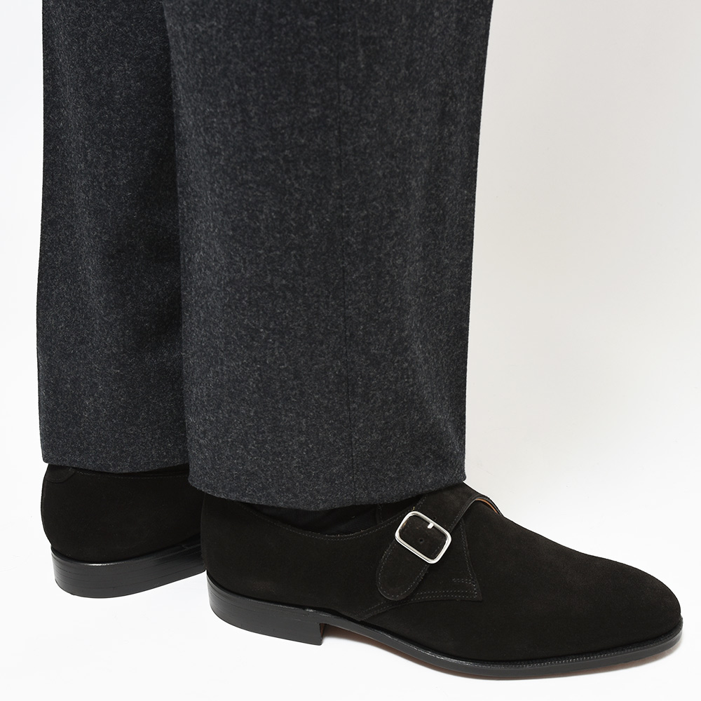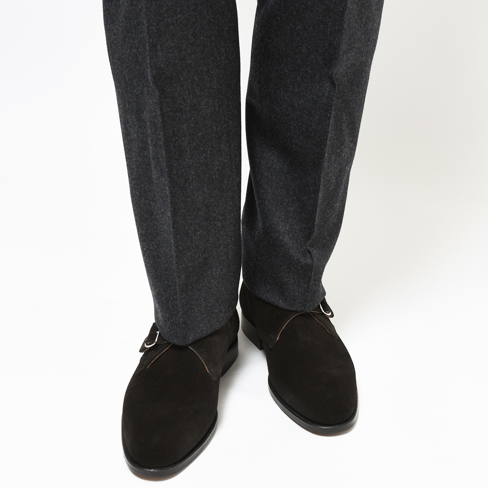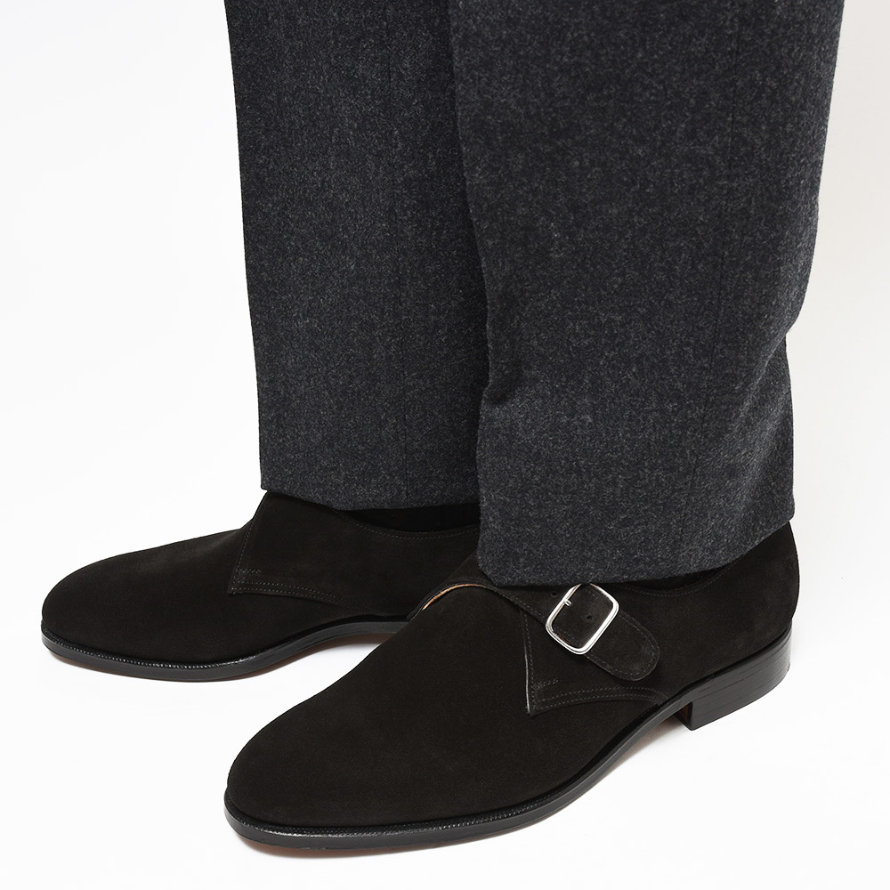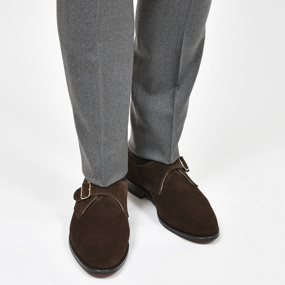 ドレススタイルには欠かせないモンクストラップシューズですが、スエード素材であれば少しカジュアルダウンしたスタイルにも合わせられます。