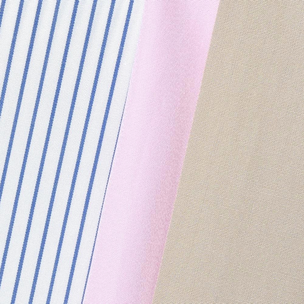 ただ、特徴は色柄にあり、従来のメンズシャツにありがちな定番的なブルー系などをやめ、来シーズンのトレンドになりそうなパステルピンク、フランスの伊達男が着そうなイメージのエレガントなベージュ、それにオーソドックスで品の良いホワイト×ブルーのストライプ柄を提案致しました。