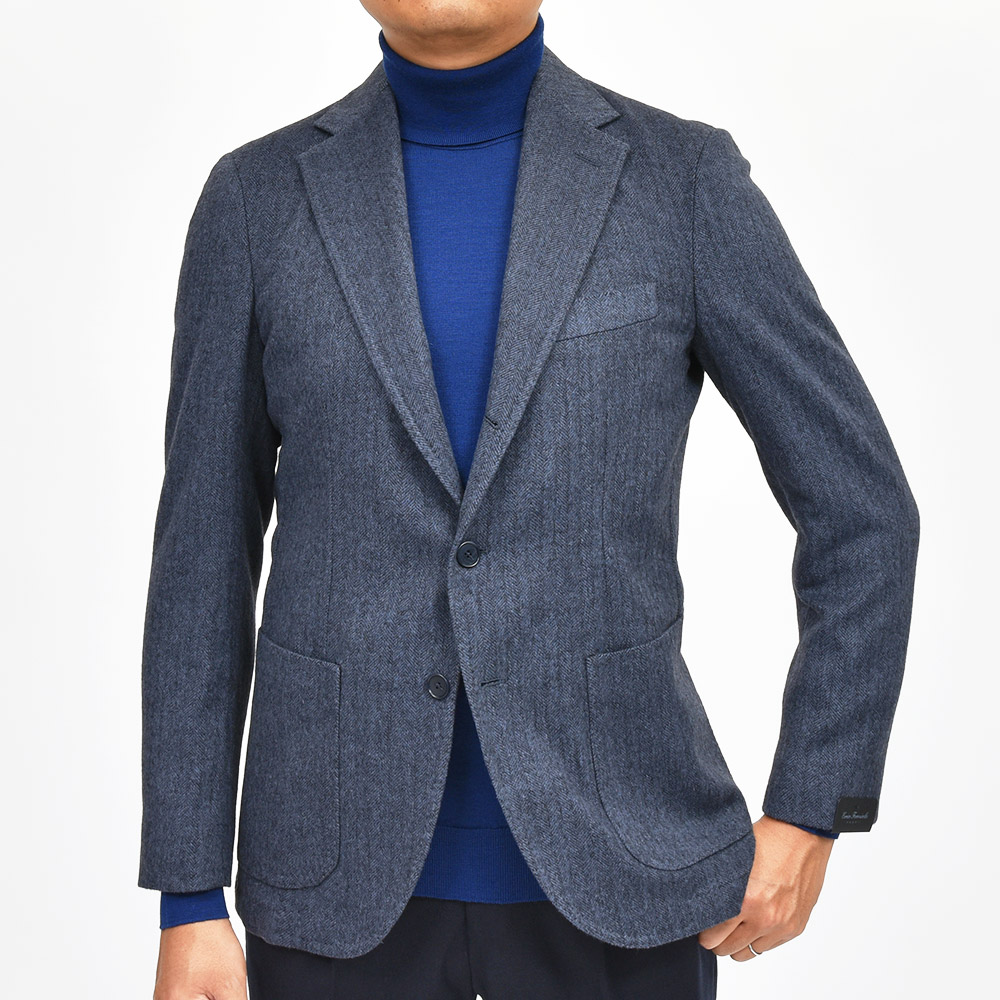 サイズ48がジャストサイズです。タイトすぎず、緩すぎずちょうどいいサイジングです。シルエットはスッキリとしています。メランジカラーが小洒落た印象のライトネイビーのヘリンボーンジャケットです!