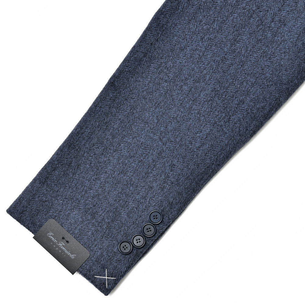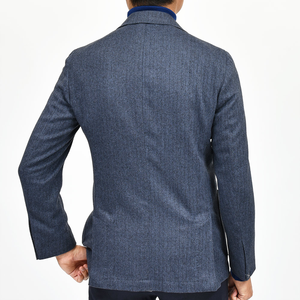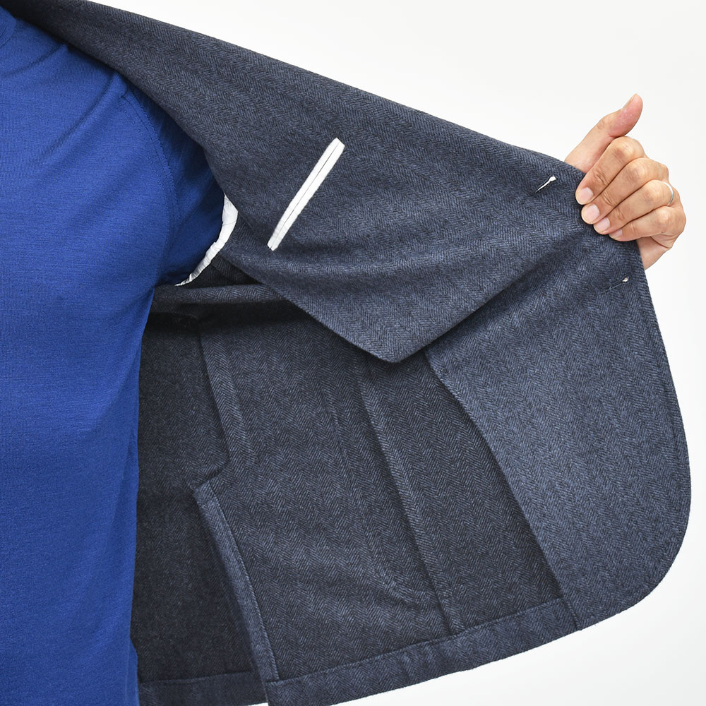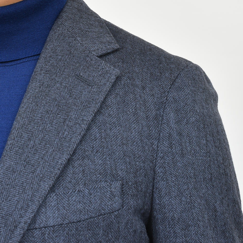 少しツイーディーなタッチのライトフランネル生地は、ウール×アンゴラの混紡素材を使用することでウールらしい柔らかさと滑らかさに、アンゴラ特有の毛足によって季節感を演出。また、グレイッシュなブルーとダークネイビーを使用したヘリンボーンによって、端正でモダンな佇まいを作り上げています。