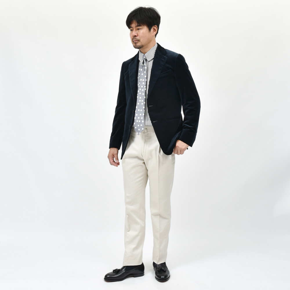 肩山は低目のイタリア式で、ナポリ式のラウンドカフを引用。手首も可動域も確保しています。