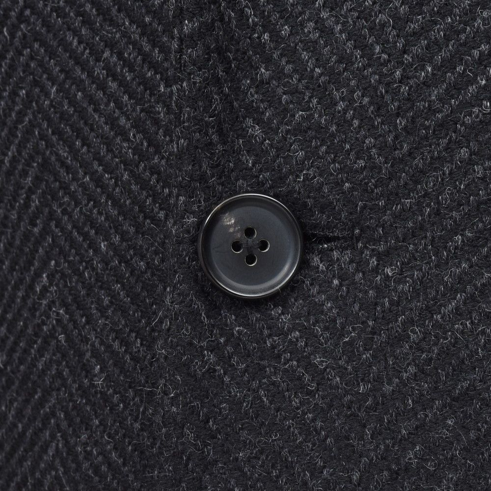 650g/mの梳毛ヘリンボーンツィード生地を用い、肩・胸周りには芯地を入れたキリッとした見え方を、それでいてラインとしては柔らかな丸みが感じられるように整えられています。