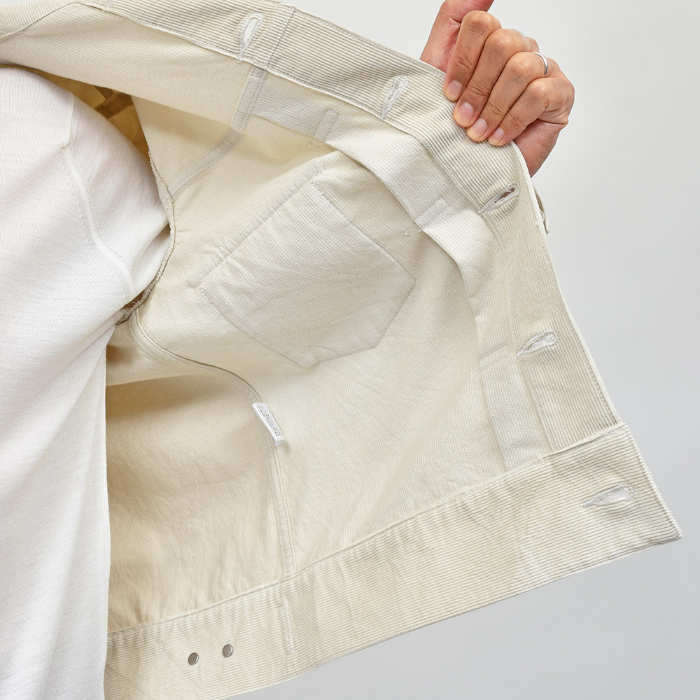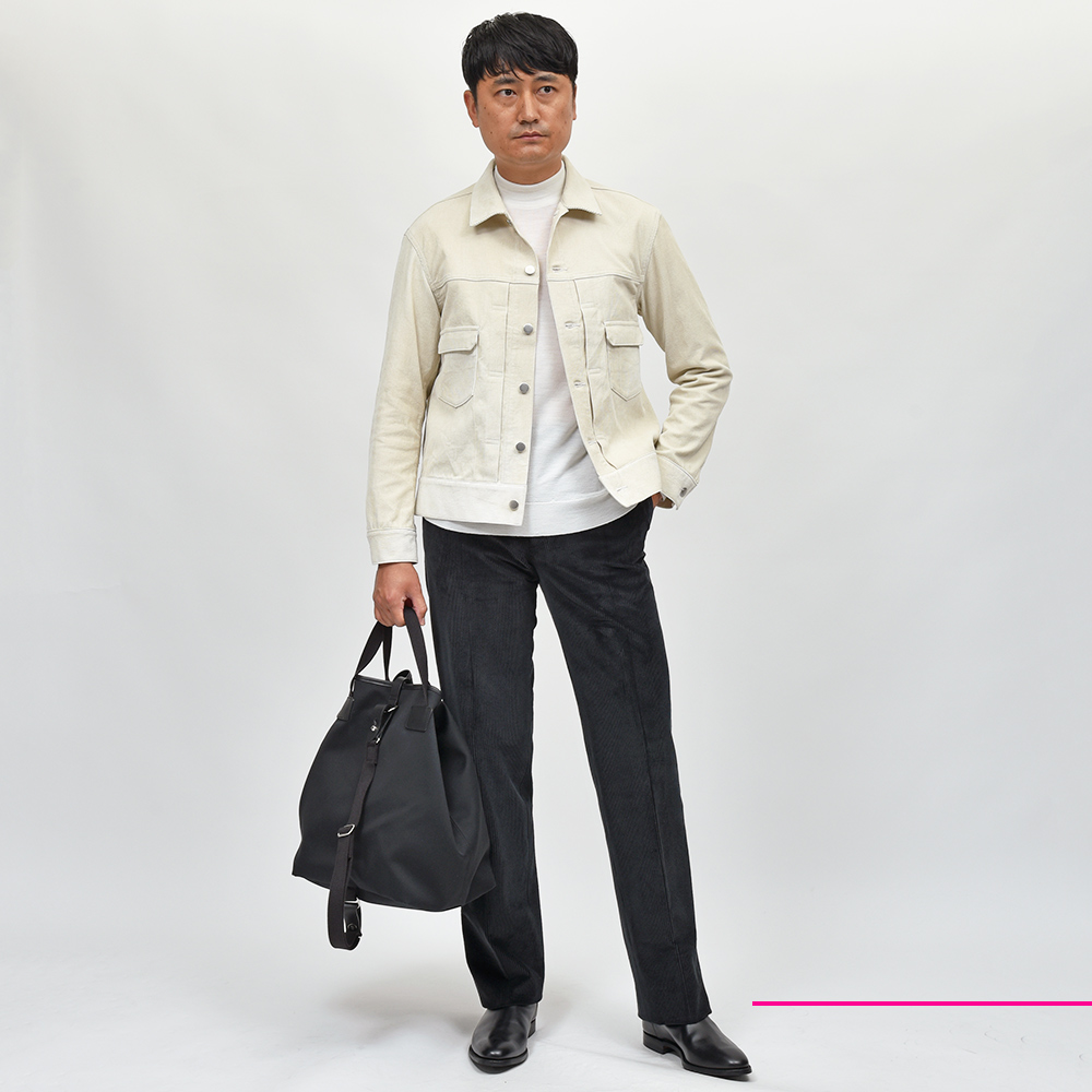 イタリア人と日本人の二人組によるブランド“Jeanik(ジーニック)”。こちらは細畝でライトな生地感のコーデュロイを使用した、通称2ndモデルを踏襲したデザイン。特徴的なフロント部分のプリーツや、両胸のパッチ&フラップポケット、ウエストのサイズアジャスターといったデザインを残しつつも、随所に現代的なアップデートが施されています。