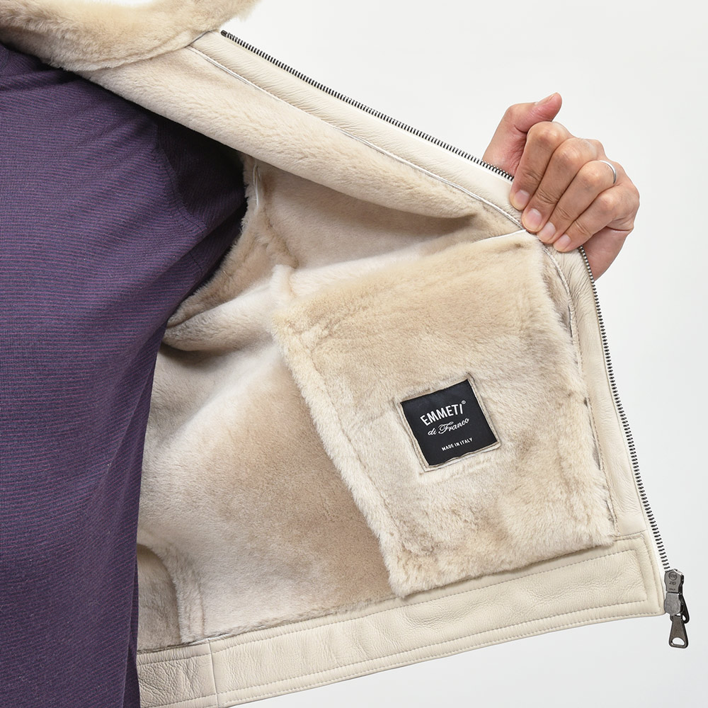 某ラグジュアリーブランドの生産キャンセルにより、格安でEMMETIに持ち込まれた着数に限りのある“SPレザー”シリーズ。こちらはEMMETI社では通常取り扱っていない、ハイグレードなムートン素材になります。柔らかくもっちりとした革の風合いはラグジュアリーな雰囲気。さらにフルムートン仕立てですので、非常に軽く着やすい重量となっています。それぞれ裏面は、アイボリー(GHIACCIO)がストレートヘア、ブラック(NERO)がカールヘアになります。