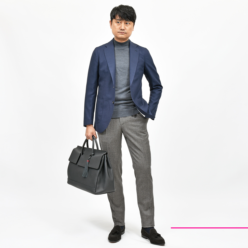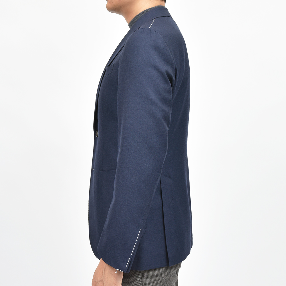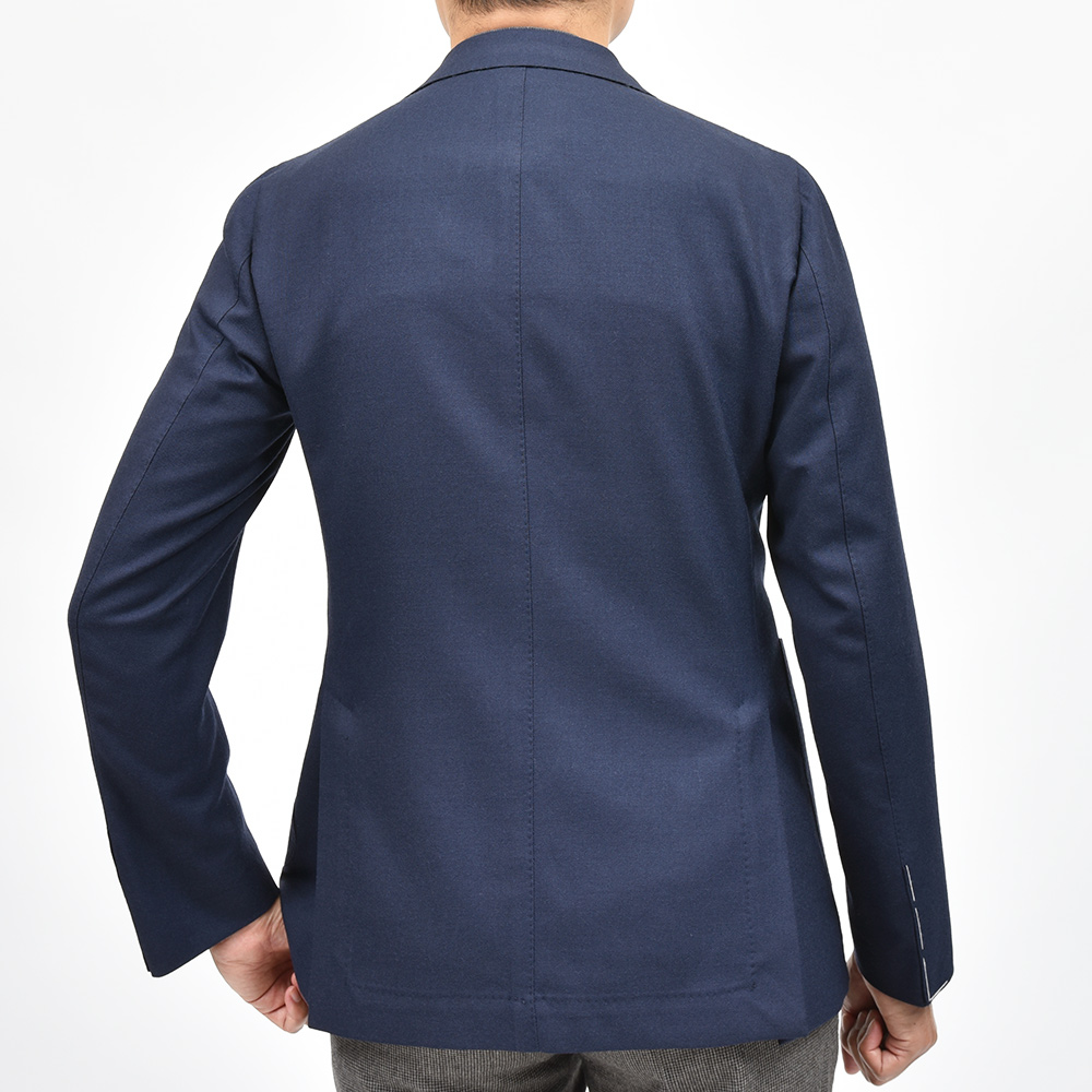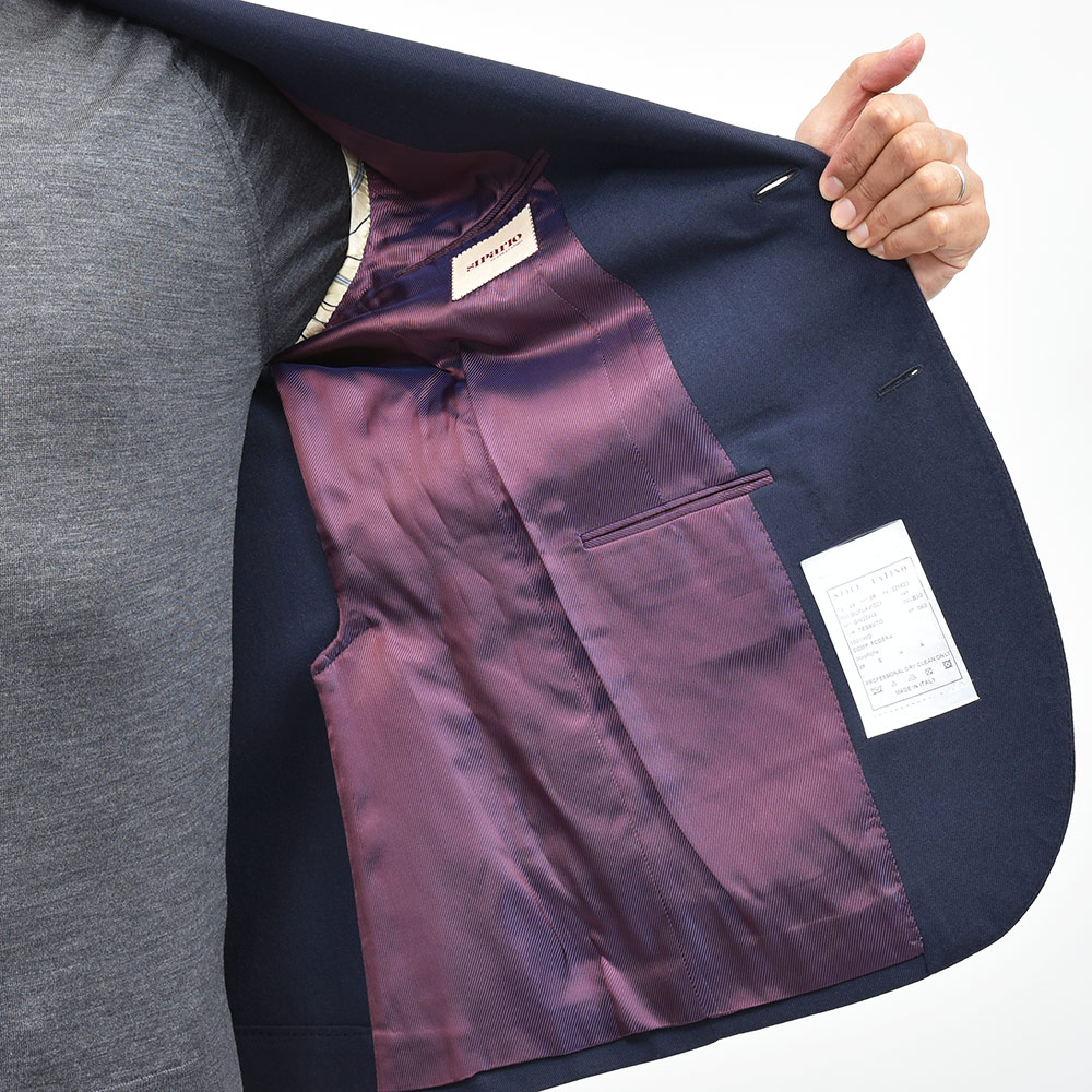 目付け280gのやや軽めのウールツイル生地は、仄かな起毛感のによって春から秋にかけての3シーズンで着用することができます。また、使い勝手の良いネイビーソリッドのシンプルなジャケットは、半毛芯の2つボタンシングルジャケットのモデル“FLAVIO”を採用していますので、クラシカルな重厚感よりも現代的で軽やかな印象をもたらせてくれます。