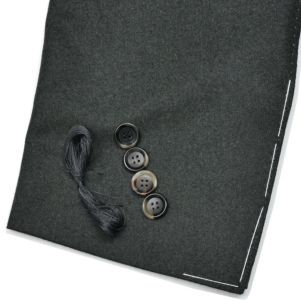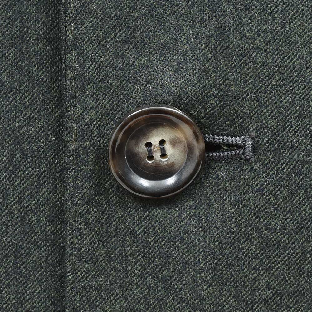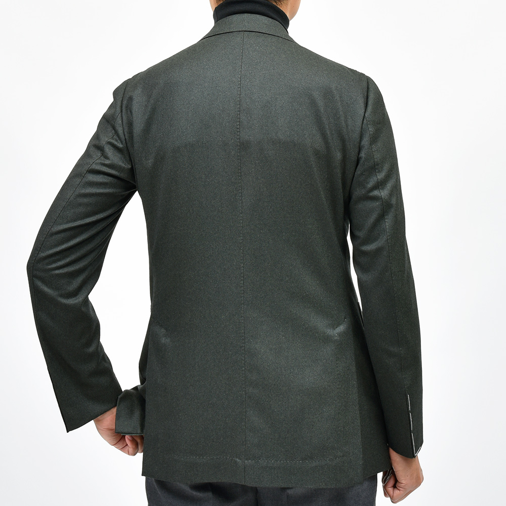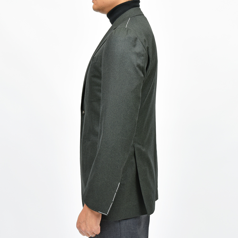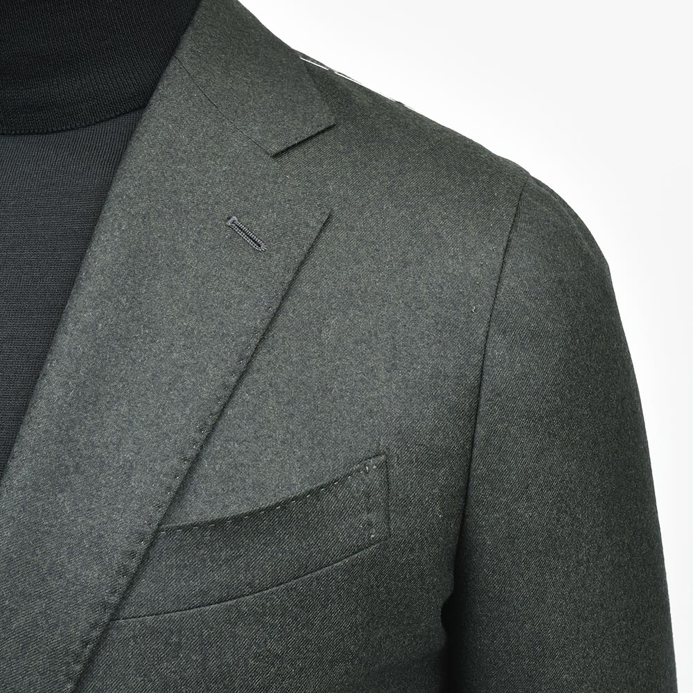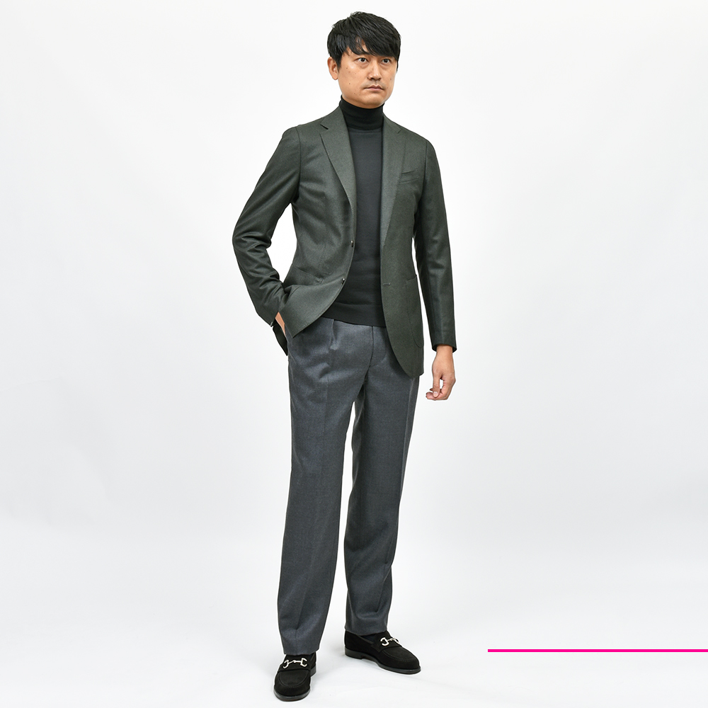 ヴァージンウールを使用した軽やかなライトフランネル生地は、程よいウォーム感と柔かで滑らかな少し艶のある表情が色気ある雰囲気。同系色のメランジを効かせた味やトーンも深いグリーンですので、悪目立ちすることなくシックにスタイリングを彩ってくれます。また、半毛芯の2つボタンシングルジャケットのモデル“FLAVIO”を採用していますので、クラシカルな重厚感よりも現代的で軽やかな印象をもたらせてくれます。