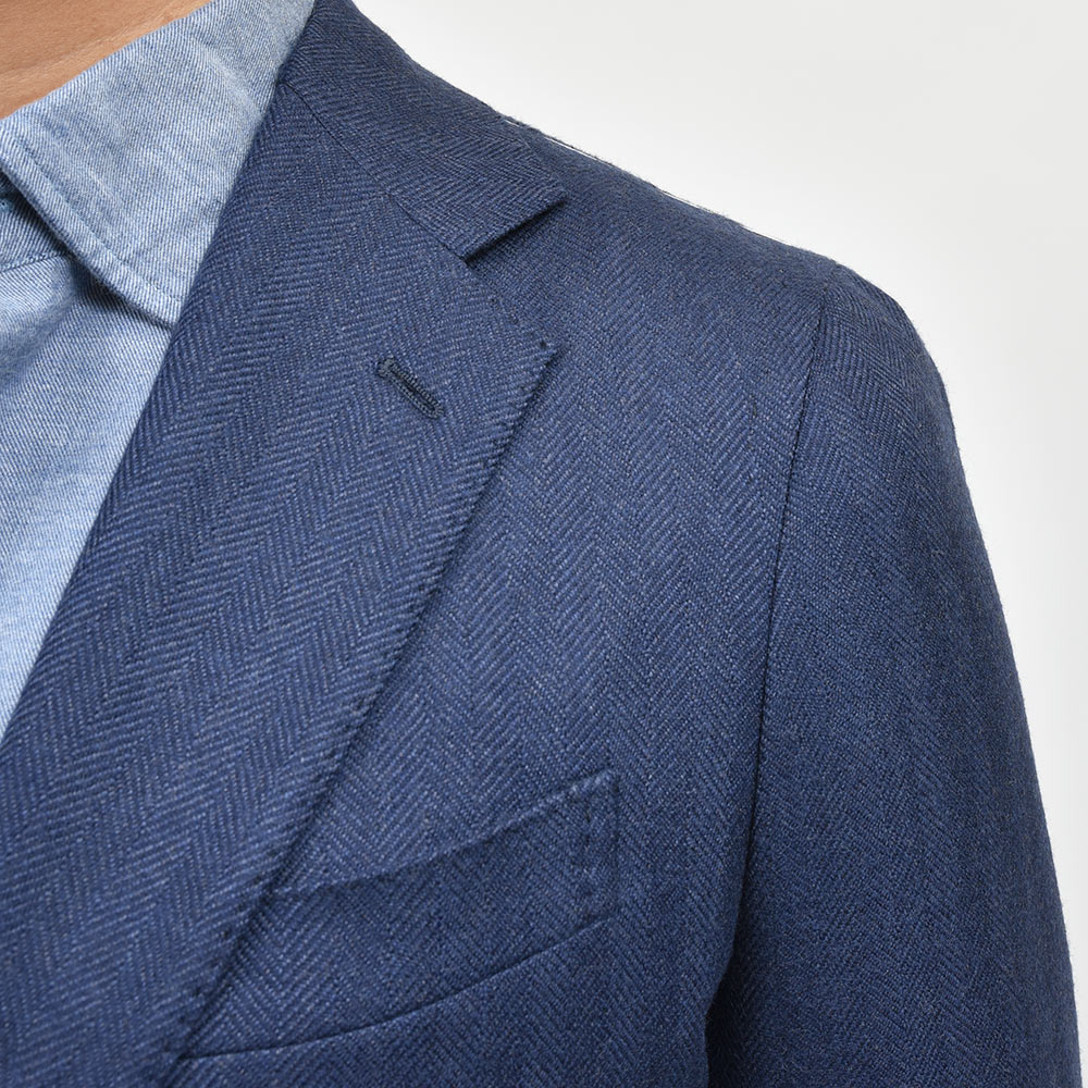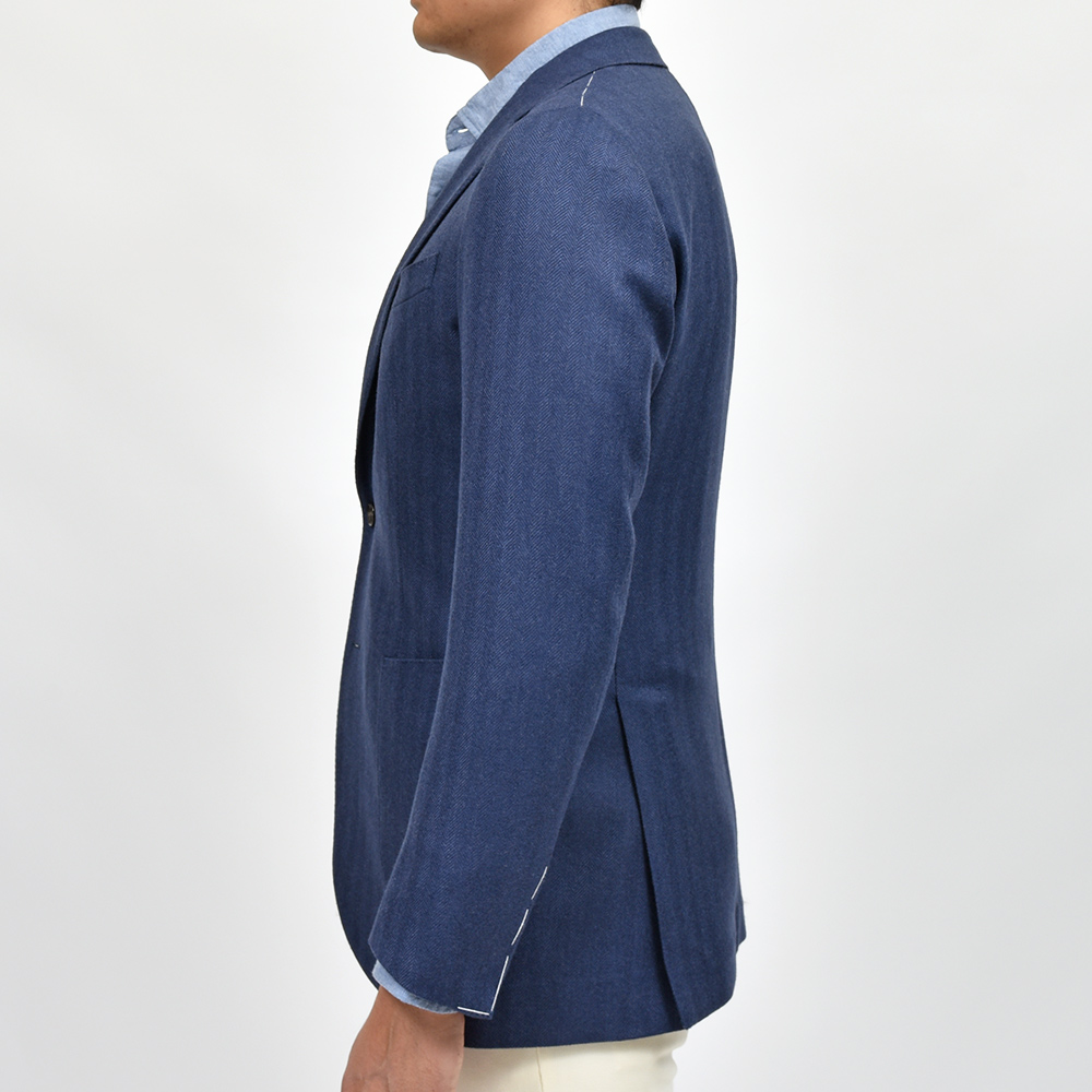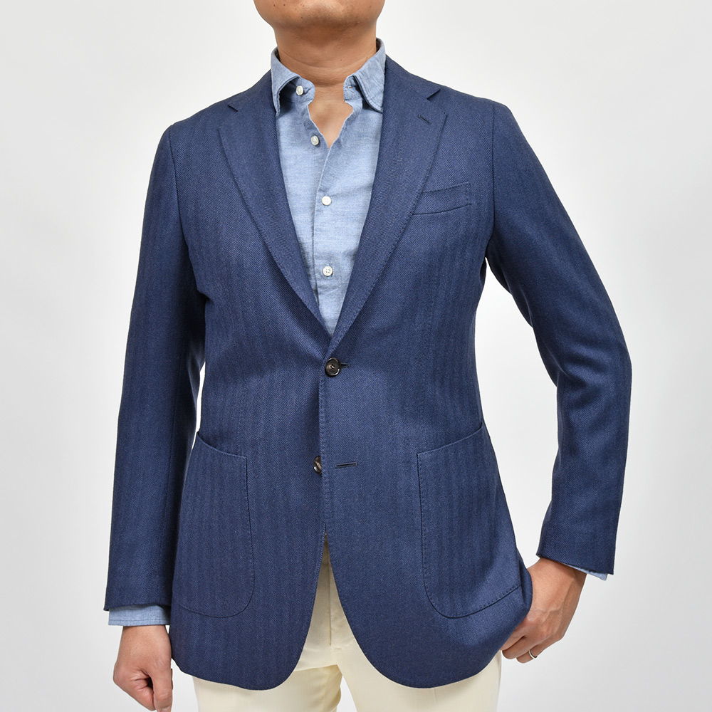 少し青みのあるネイビーのヘリンボーンだからこそ、華やかな色気とジャケットとしての汎用性を持ち合わせた一着となっています。