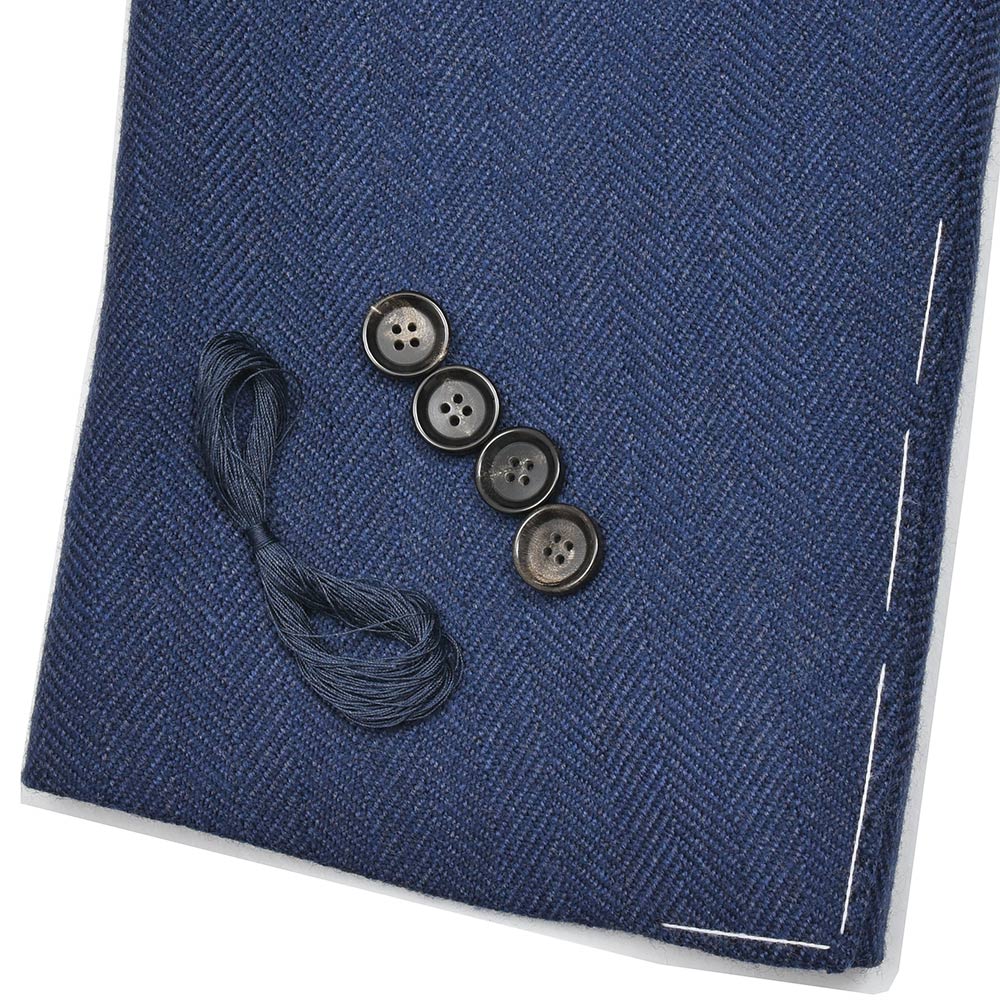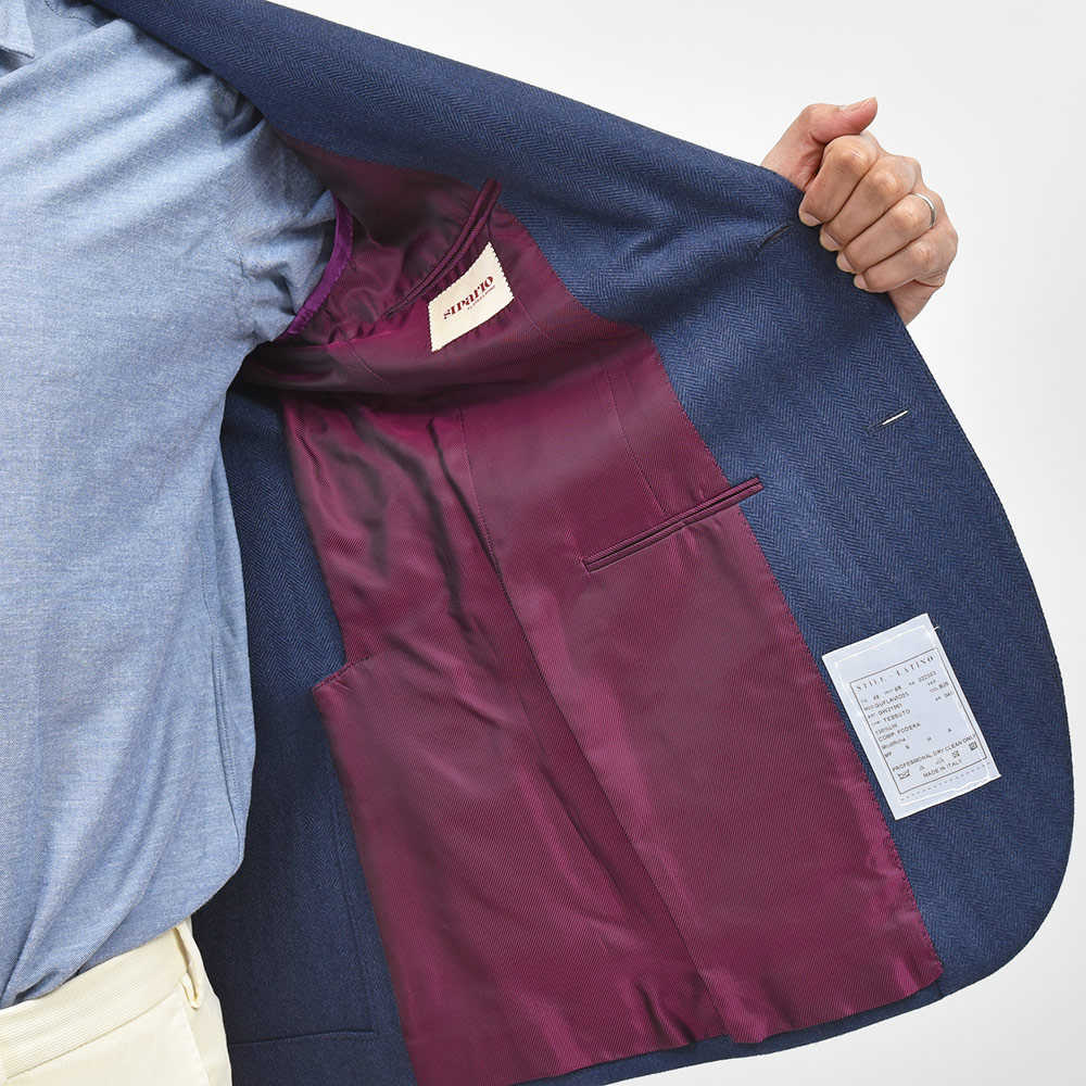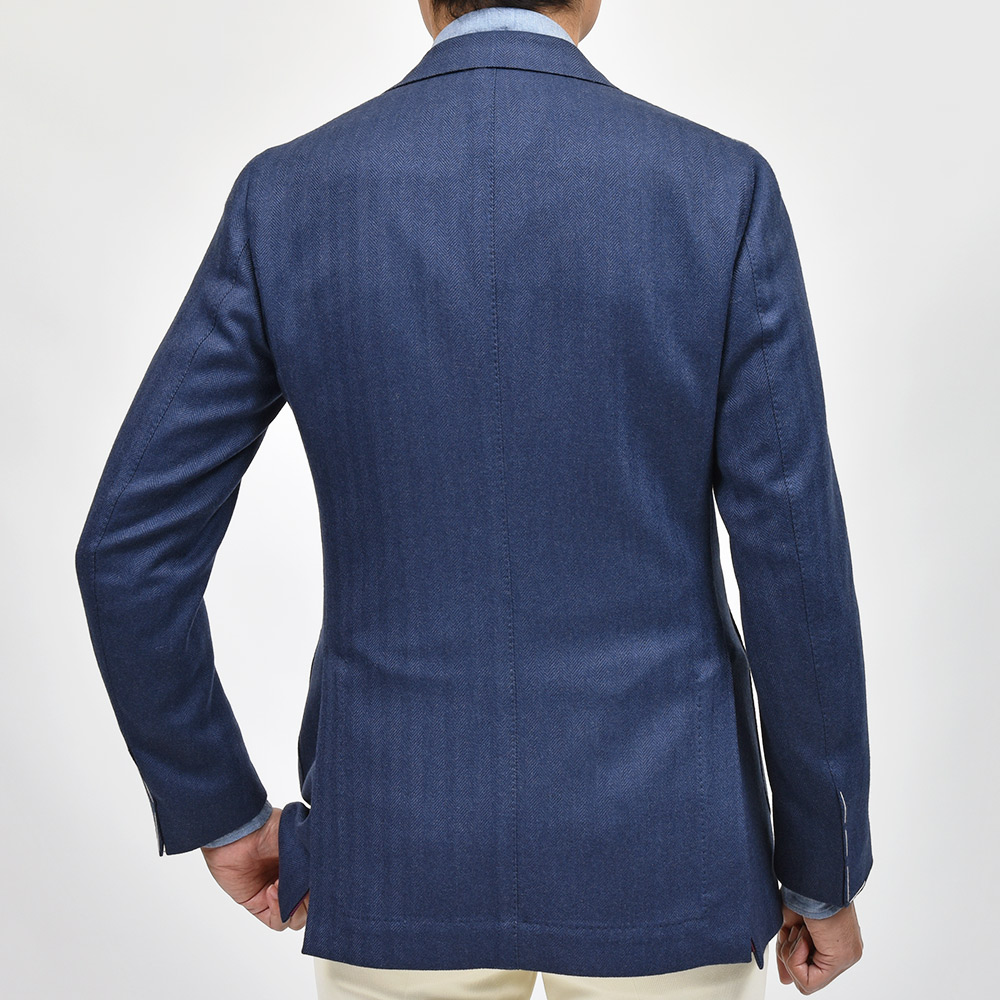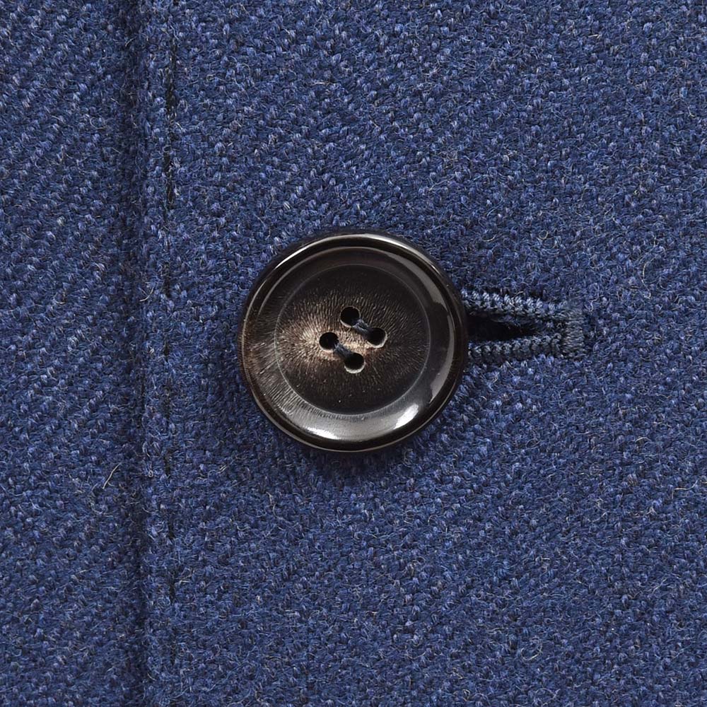 少し青みのあるネイビーのヘリンボーンだからこそ、華やかな色気とジャケットとしての汎用性を持ち合わせた一着となっています。