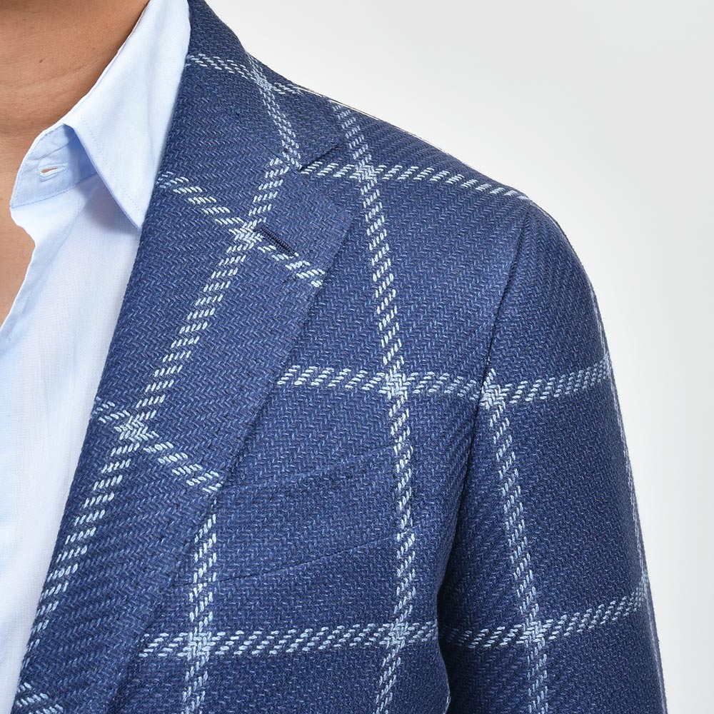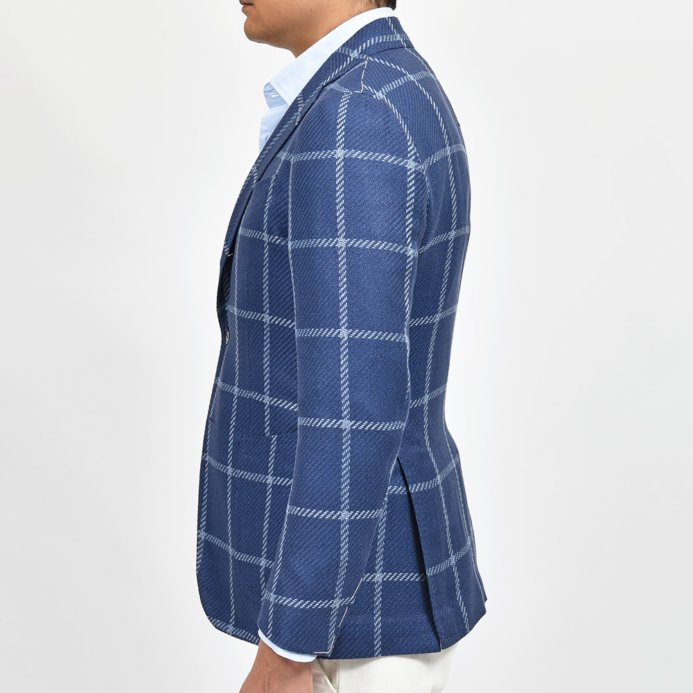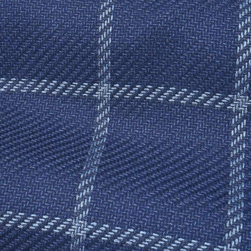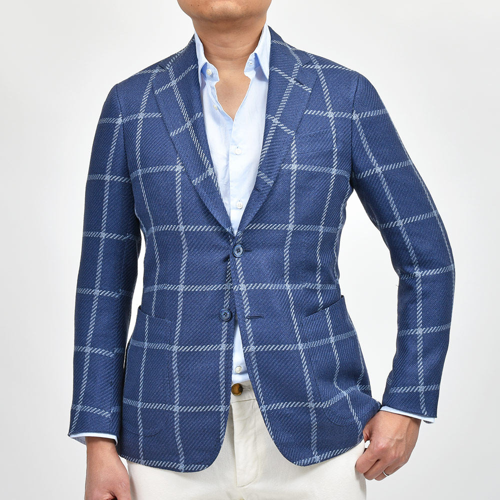 目付け280gのシルク×リネン×コットンの三者混生地は、明るめのネイビーをベースにサックスブルーのウインドウペーンが爽やかな色気を香らせてくれる、STILE LATINOのエクスクルーシブファブリックになります。シルクやリネンの張りと艶のある質感にコットンの柔らかさ、さらにジャガード織りがシャリ感のあるタッチを生んでいる独自の質感が魅力です。