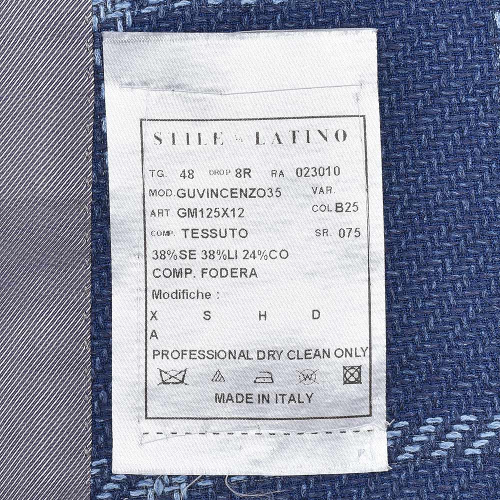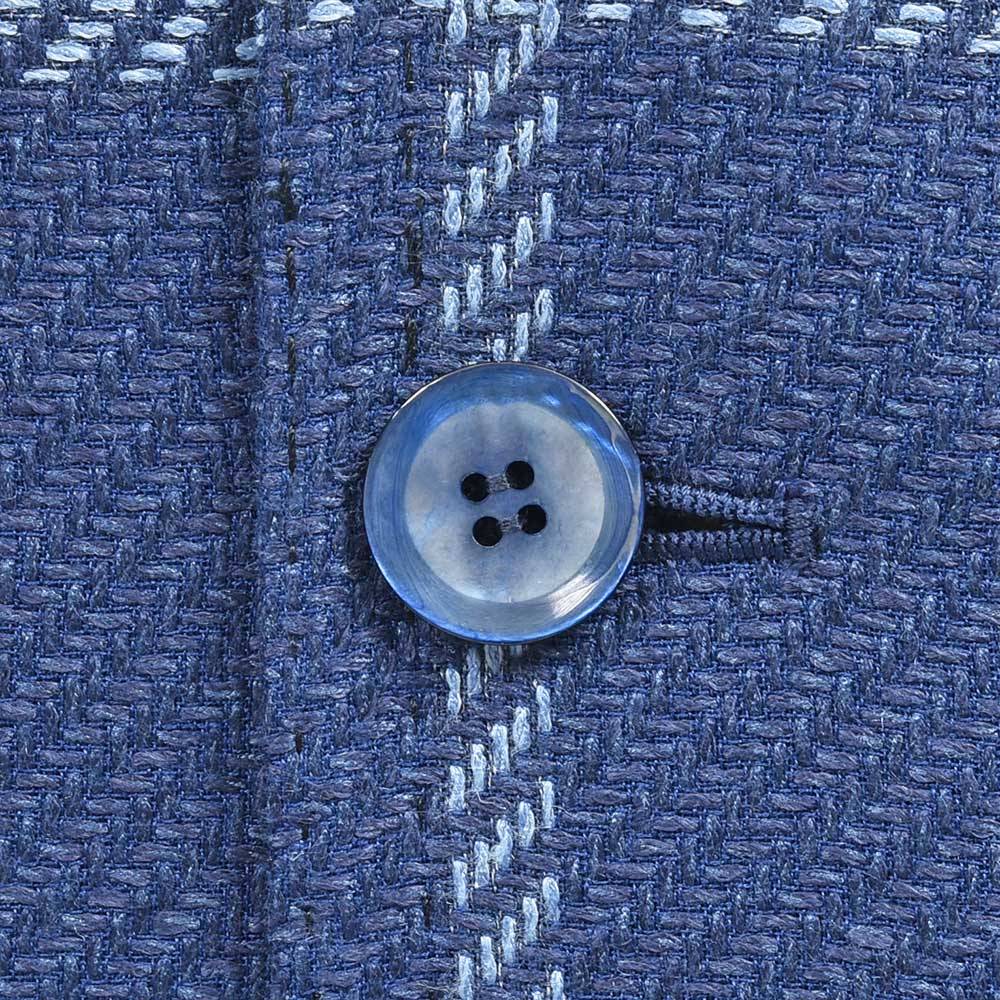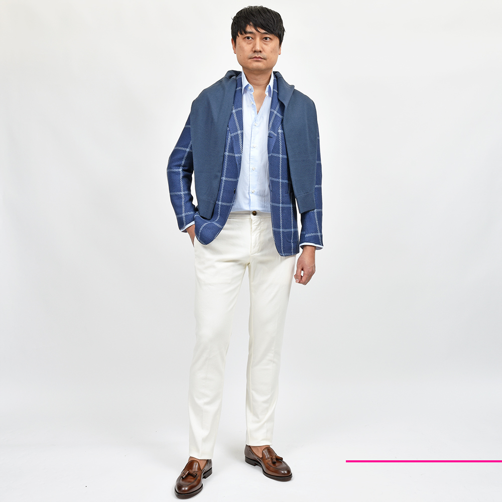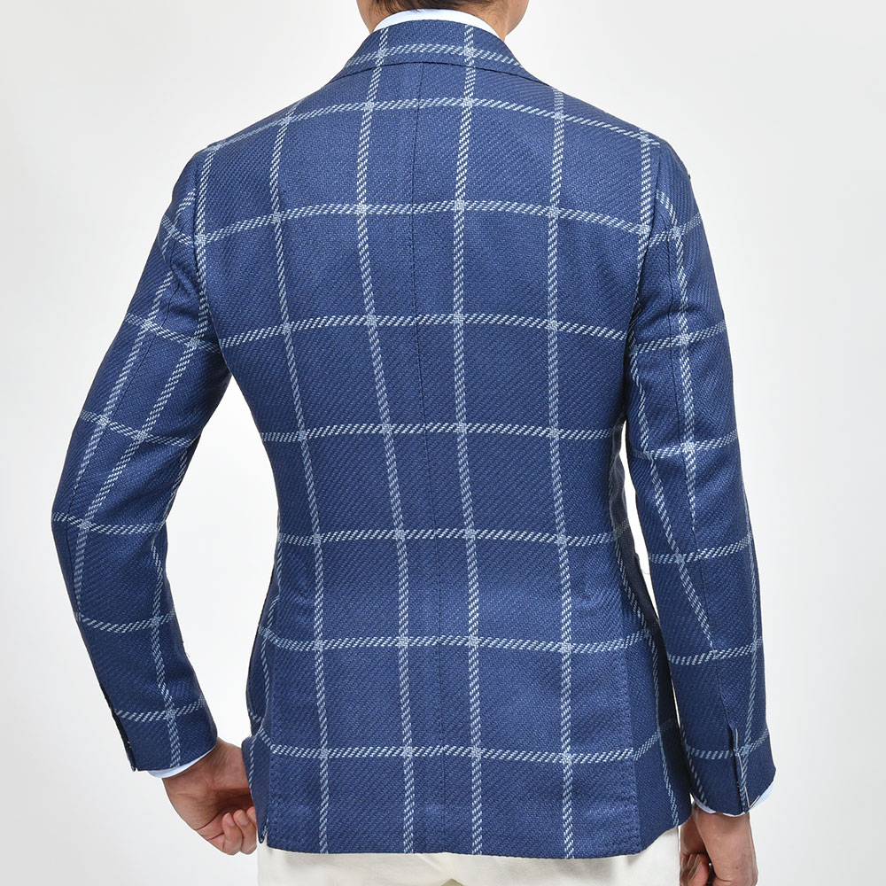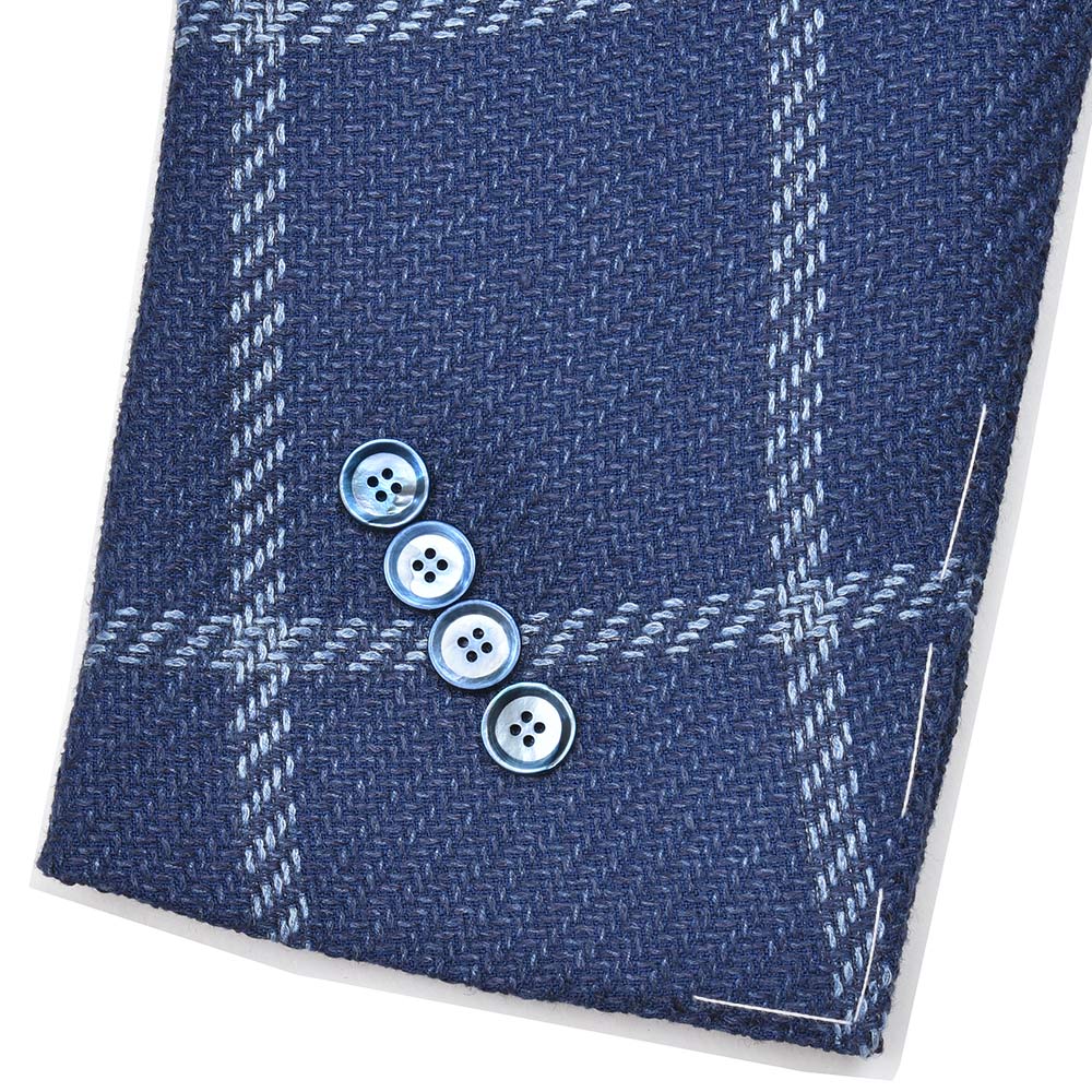 目付け280gのシルク×リネン×コットンの三者混生地は、明るめのネイビーをベースにサックスブルーのウインドウペーンが爽やかな色気を香らせてくれる、STILE LATINOのエクスクルーシブファブリックになります。シルクやリネンの張りと艶のある質感にコットンの柔らかさ、さらにジャガード織りがシャリ感のあるタッチを生んでいる独自の質感が魅力です。