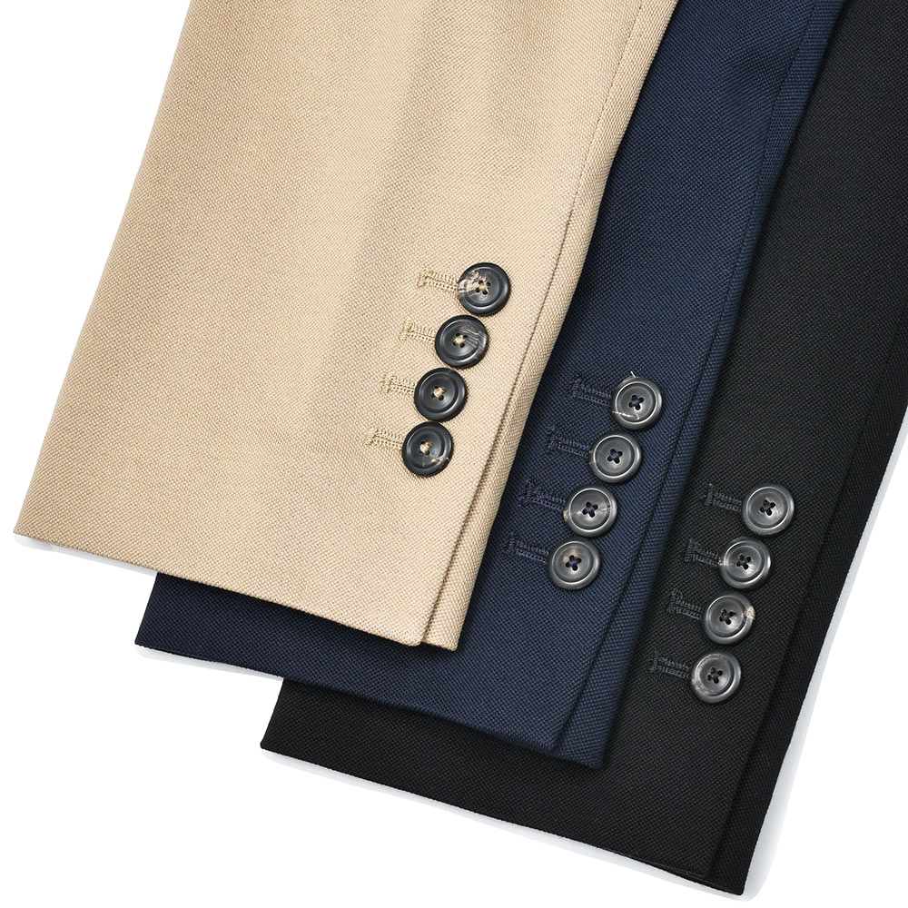 パッチポケット、サイドベンツ、ラペル巾8cm、袖は開き見せ4つボタン並び(袖詰めは肩からになります)です。
