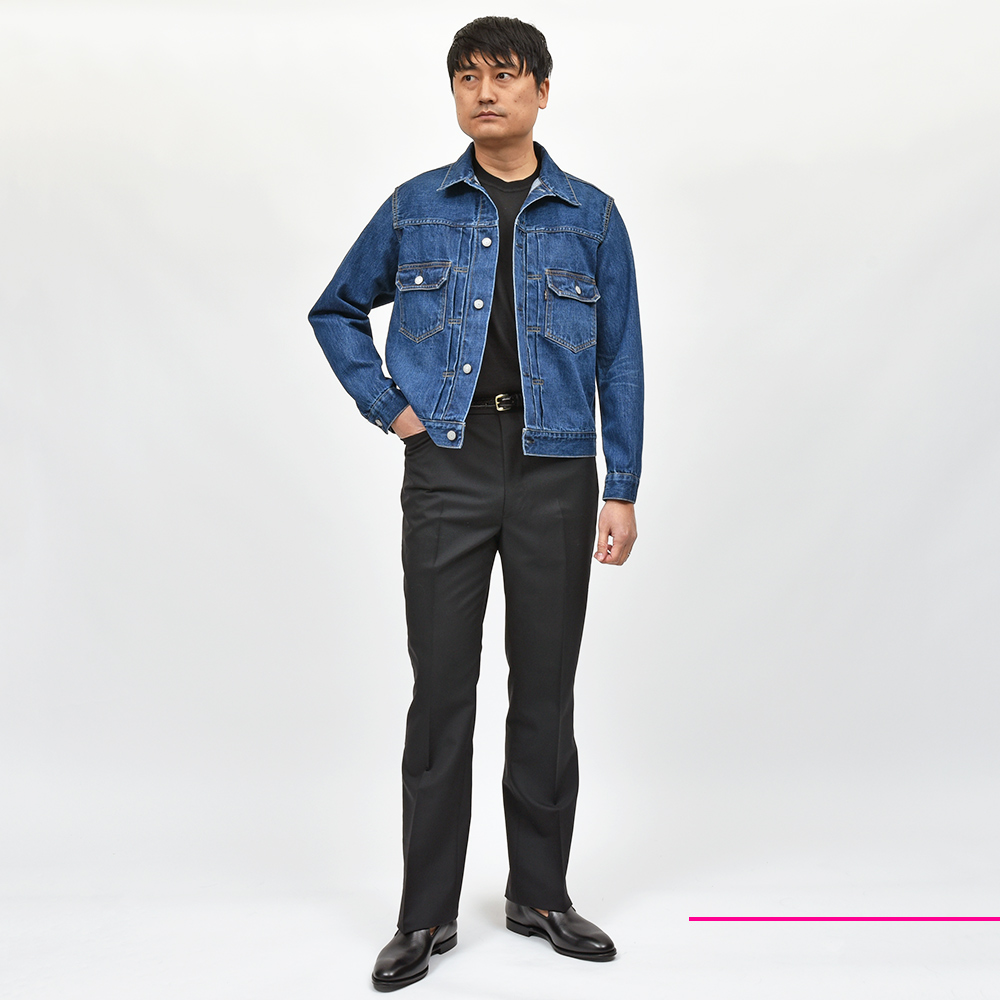 こちらのモデル“CARNABY(カーナビー)”は、1960年代にロンドンのカーナビー・ストリートを発信源に生まれたファッションスタイル「Carnaby look」をイメージ。花柄のシャツやネクタイ、パンツ、ミリタリー調のファッションを指し、モッズルックやピーコックファッションとも呼ばれています。この時代のファッションをイメージしつつも、股上を深くしワタリを広くすることで現代的なニュアンスを持たせています。
