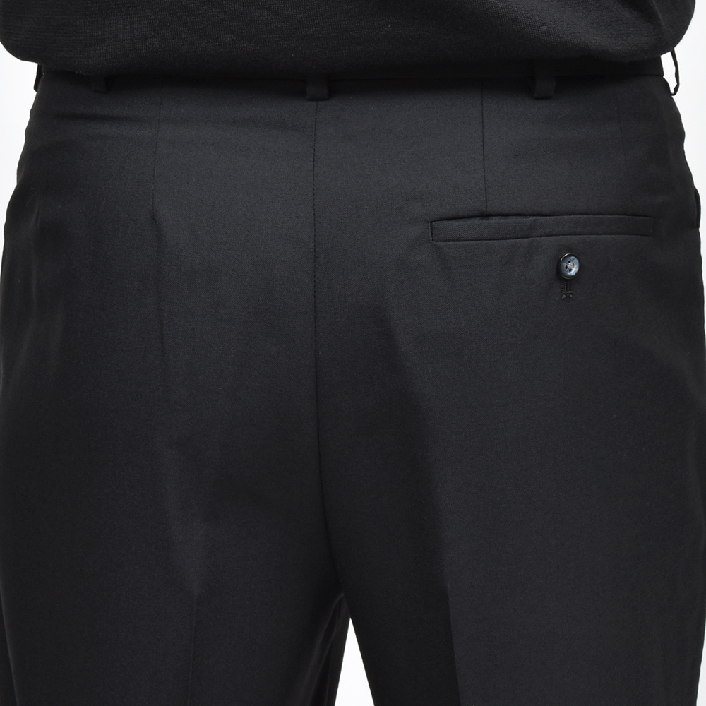 サイズ40でジャストサイズです。ウエストがやや深く、ヒップやワタリにゆとりがあります。ノープリーツでスッキリとした腰回りでワタリから膝までテーパードし裾に向かってフレアになった綺麗なシルエットです。ブラックウールがモダンな雰囲気に仕上がっています!