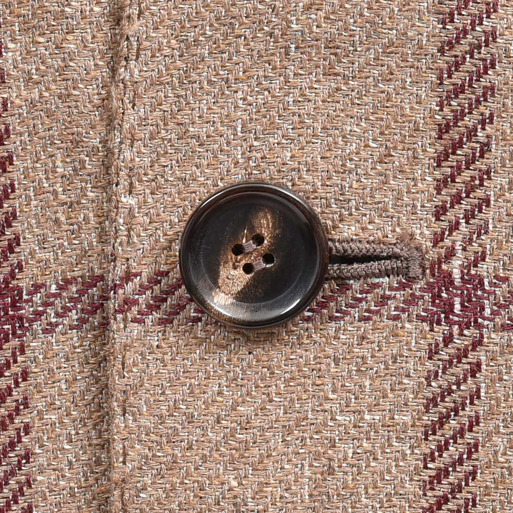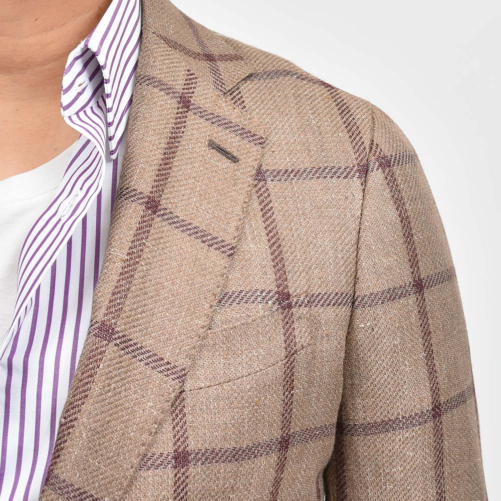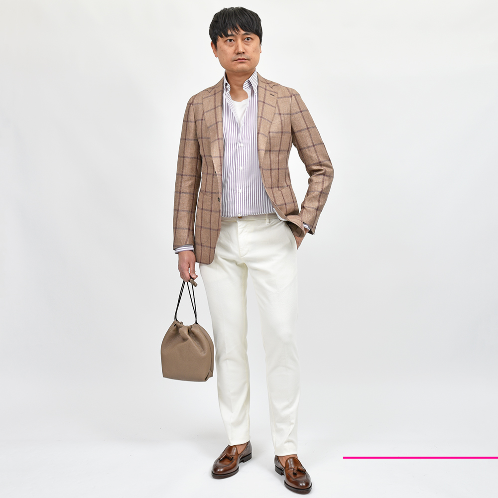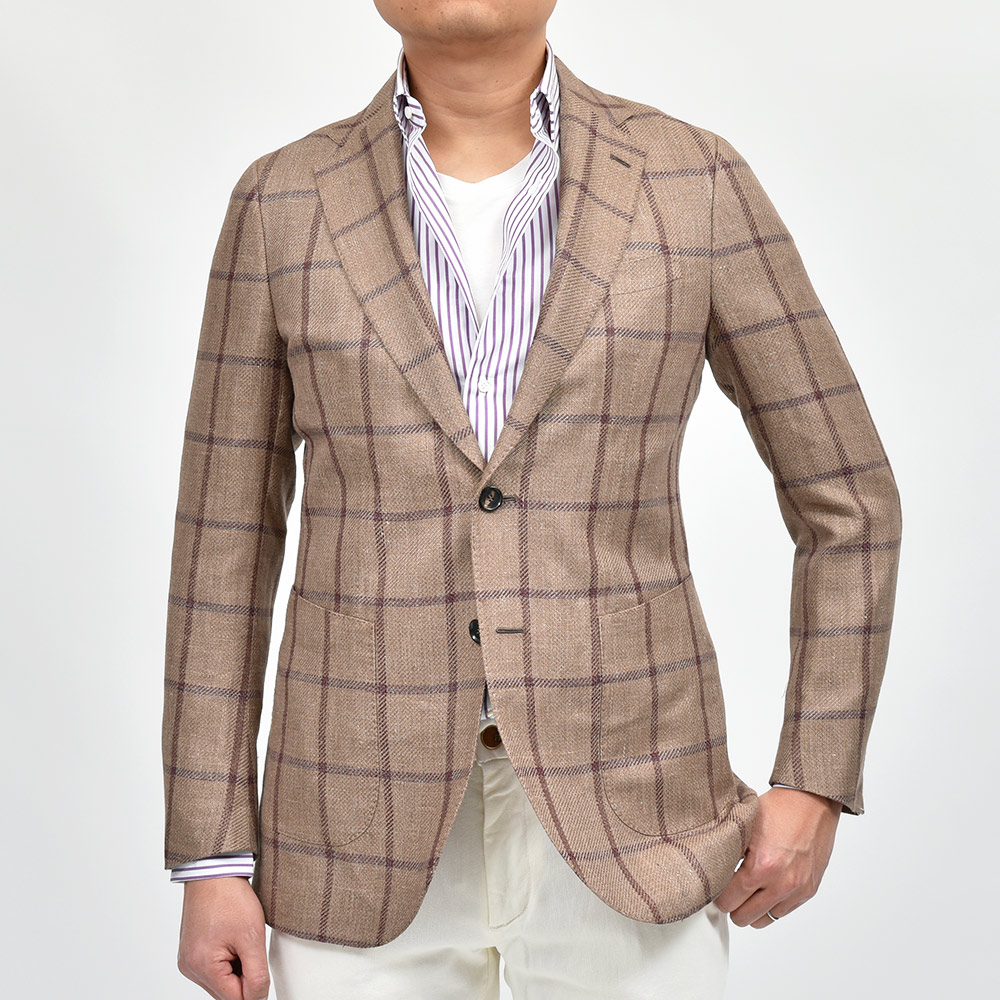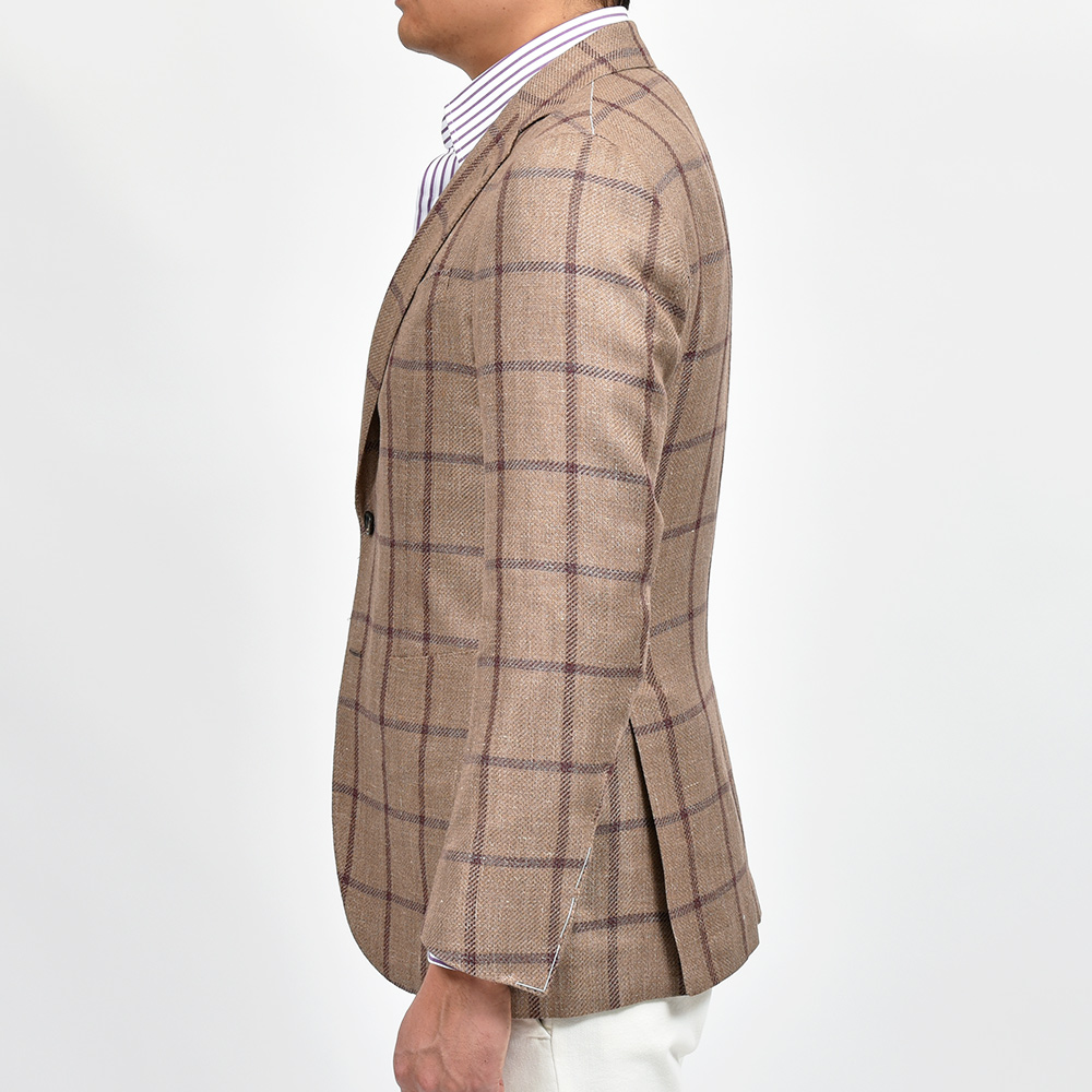 軽い目付けのウインドウペーンジャケットは、リネン特有の素材感と、アルパカの柔らかさ、さらにはシルクの仄かな光沢感が唯一無二の存在感。やや薄手の生地を採用しているため、春先から残暑の秋口までと3シーズンで着用頂けます。また、半毛芯の2つボタンシングルジャケットのモデル“FLAVIO”を採用していますので、クラシカルな重厚感よりも現代的で軽やかな印象をもたらせてくれます。