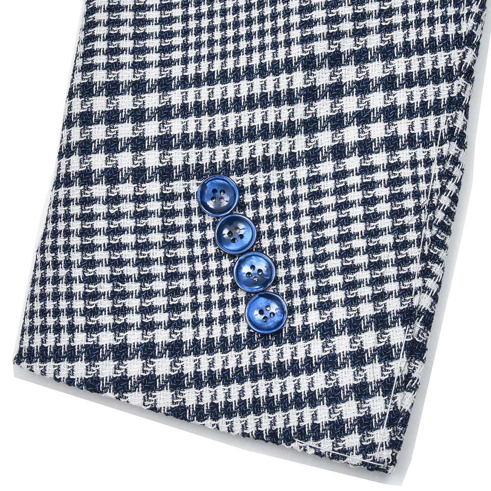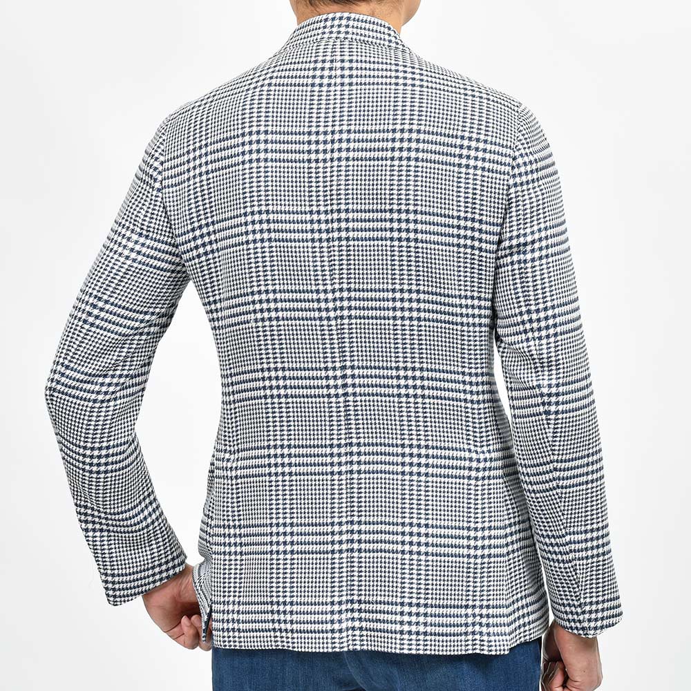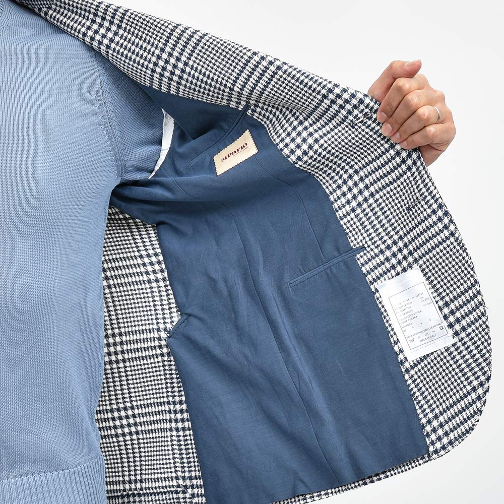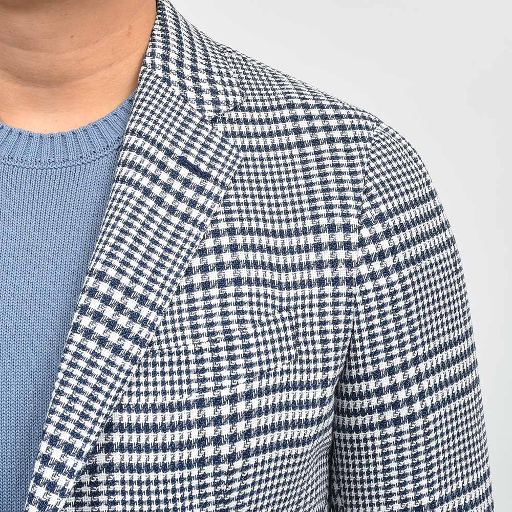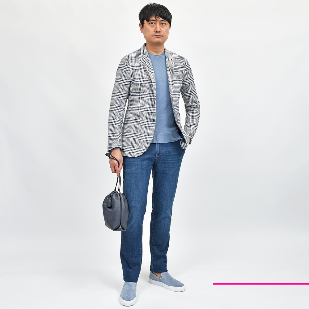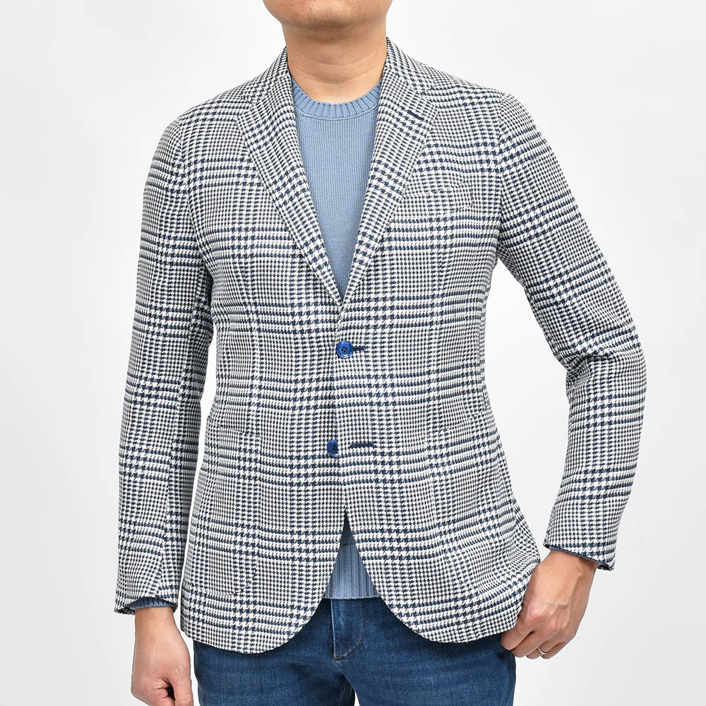 目付け280gのグレンチェックは、ホワイトをベースにダークトーンのブルーのグレンチェックが爽やかでシックな佇まい。やや薄手で少し伸縮性がありシャリっとしたタッチの生地は、清涼感がありシワになりにくく一般的なジャケットよりもかなり軽い着心地に感じられます。また、半毛芯の2つボタンシングルジャケットのモデル“FLAVIO”を採用していますので、クラシカルな重厚感よりも現代的で軽やかな印象をもたらせてくれます。
