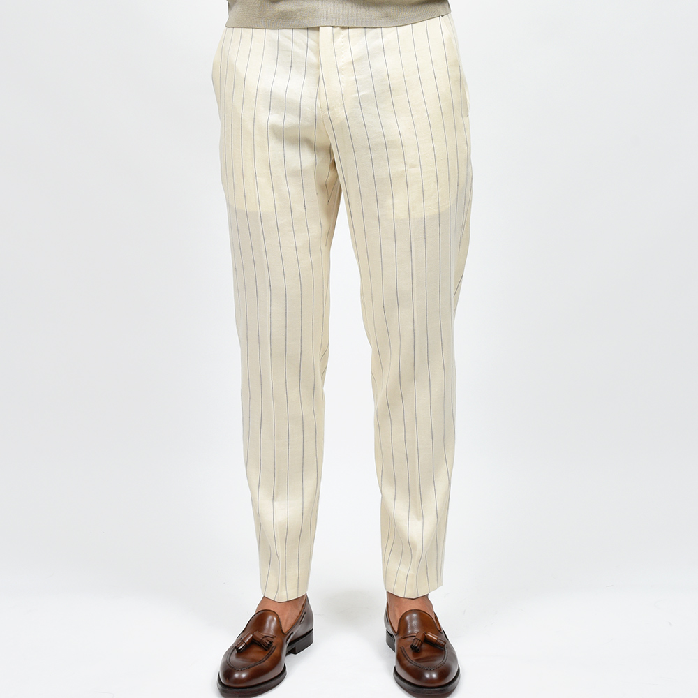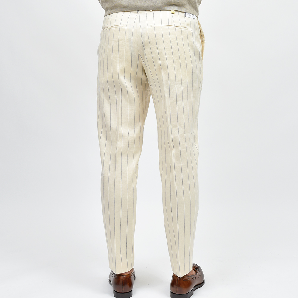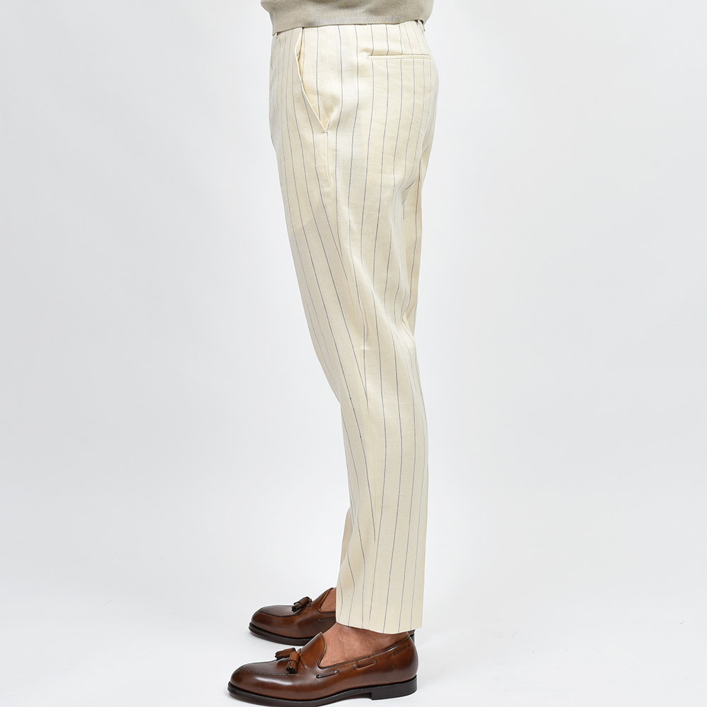 ほんのりとモダンな色気を纏わせてくれる“EDGE”シリーズ。こちら、目付け280gのリネン×コットン素材を使用したストライプパンツ。リネン特有の光沢感にドライなタッチからくるハリ感、そこにコットンを混紡することで程よくしなやかな質感に。また、ダークネイビーの細ピッチストライプがモダンな印象をもたらせてくれます。