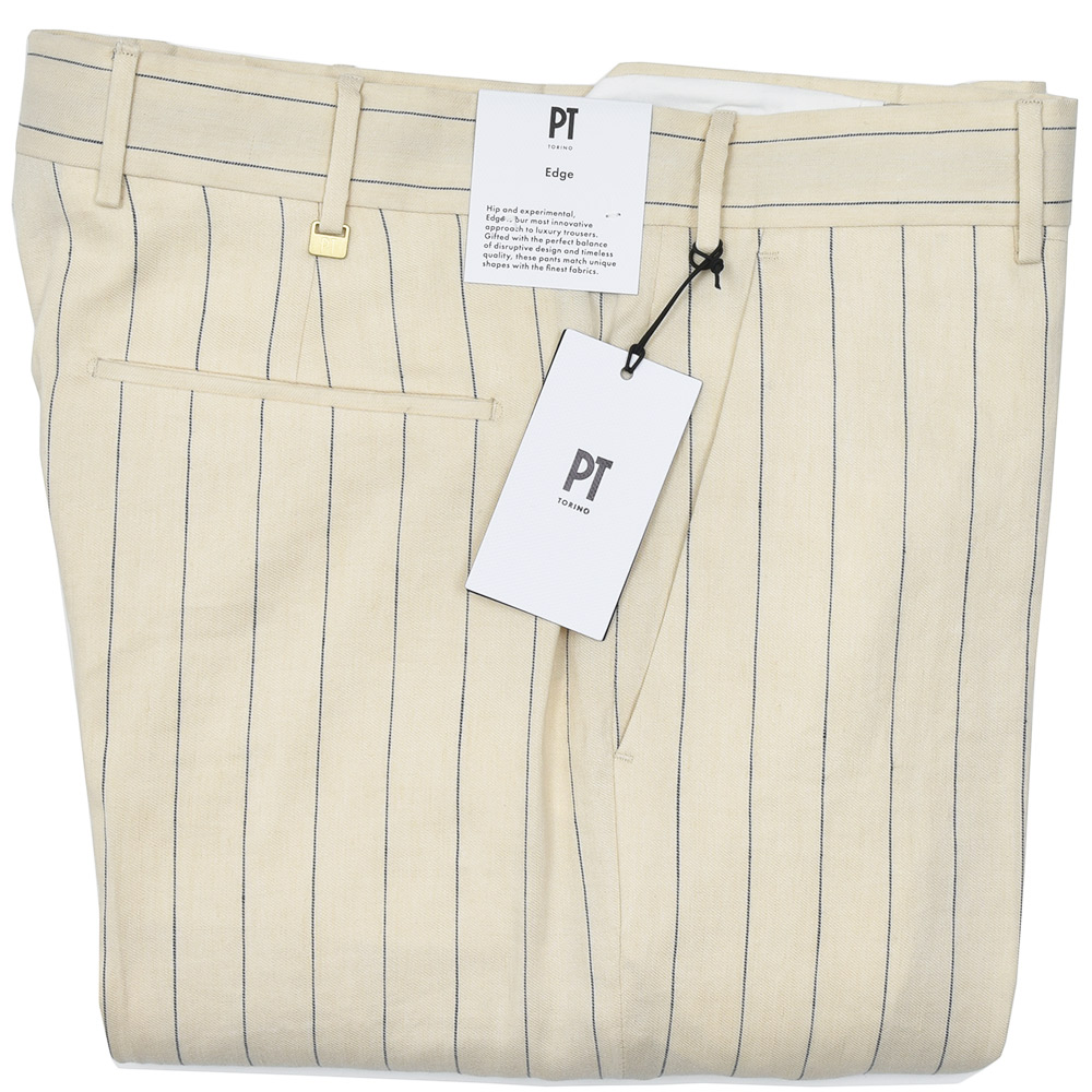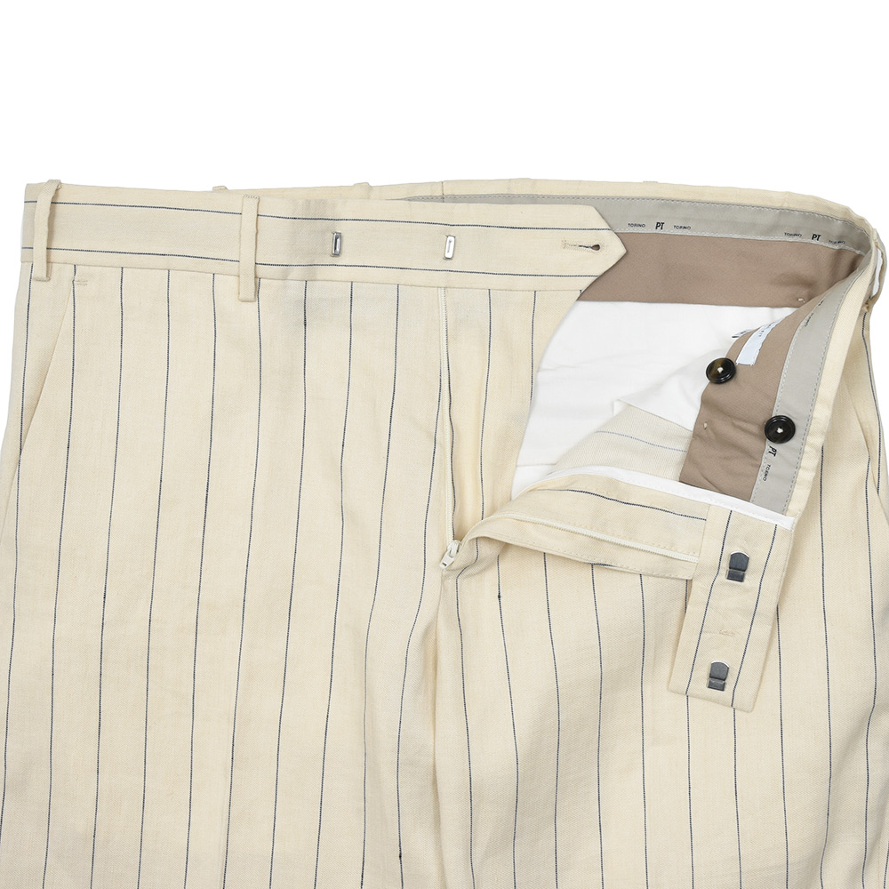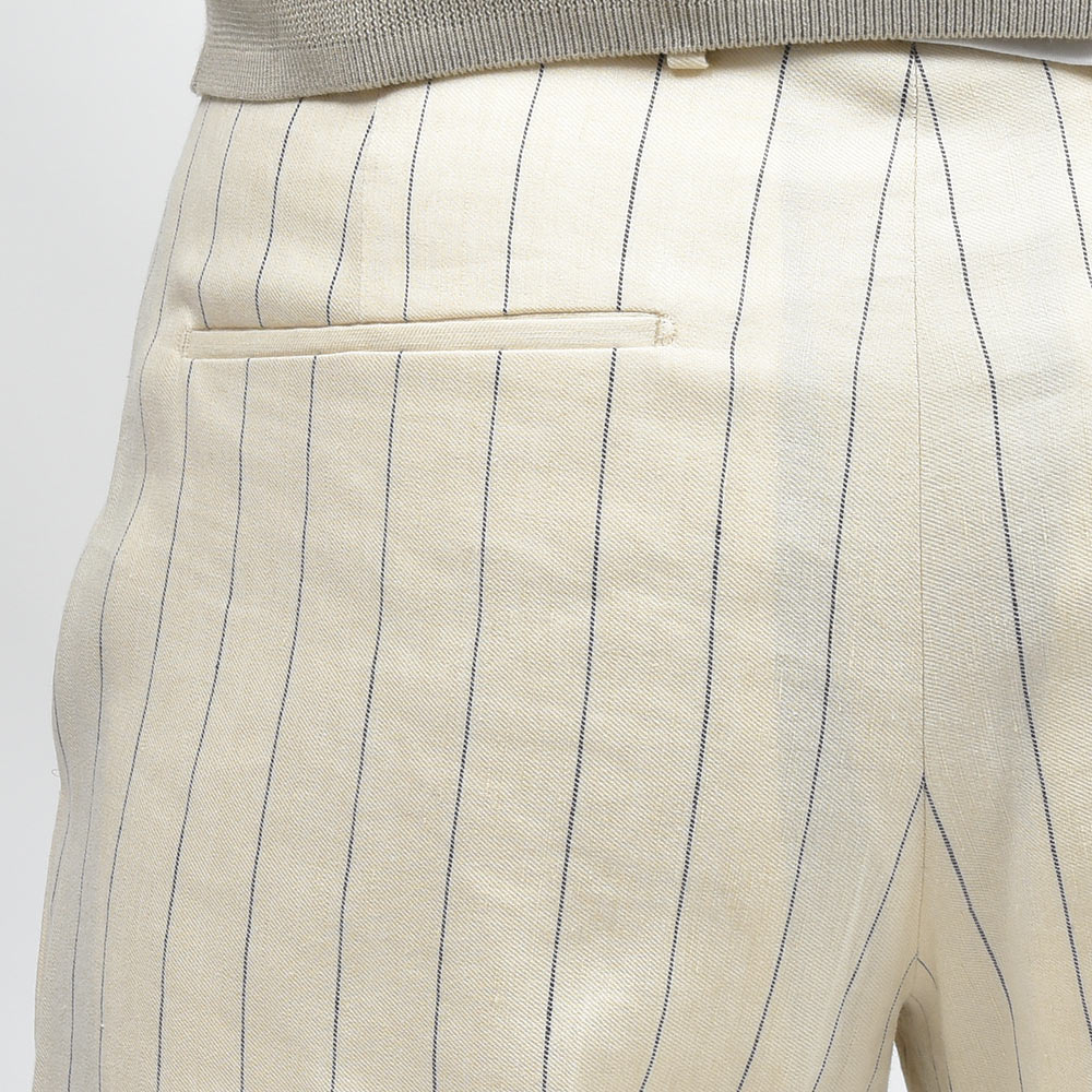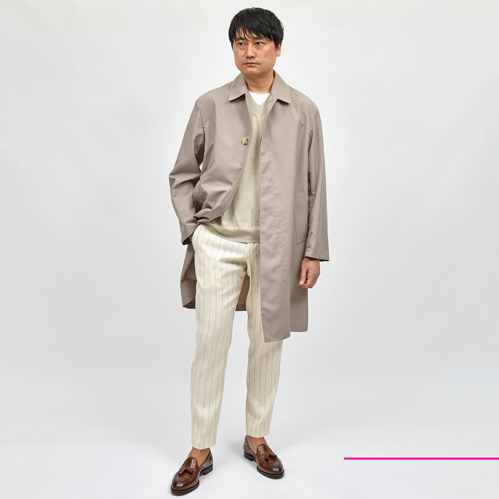 ほんのりとモダンな色気を纏わせてくれる“EDGE”シリーズ。こちら、目付け280gのリネン×コットン素材を使用したストライプパンツ。リネン特有の光沢感にドライなタッチからくるハリ感、そこにコットンを混紡することで程よくしなやかな質感に。また、ダークネイビーの細ピッチストライプがモダンな印象をもたらせてくれます。
