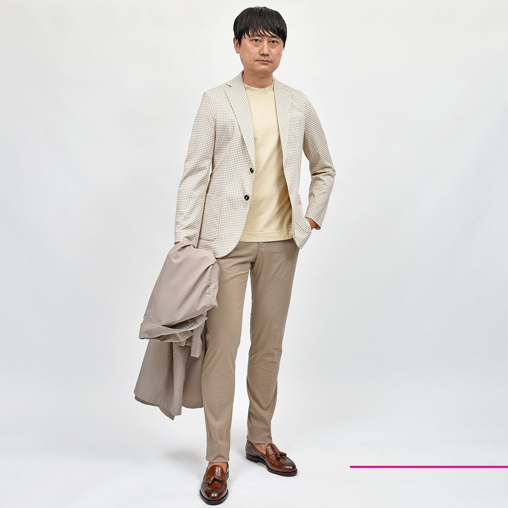 コンフォート素材を使用したセットアップの先駆者である、CIRCOLO 1901。コチラは、定番である“ピケ=鹿の子”よりもさらに目付を軽くし上品な風合いに仕上げた“プレミアムピケ”を使用。清涼感は勿論のこと、さらには伸縮性をも持ち合わせたジャージー素材というハイブリットな一着になります。程よくタイトなシルエットに、2つボタン仕様がカジュアルなジャケットとして非常に有能な働きをしてくれます。