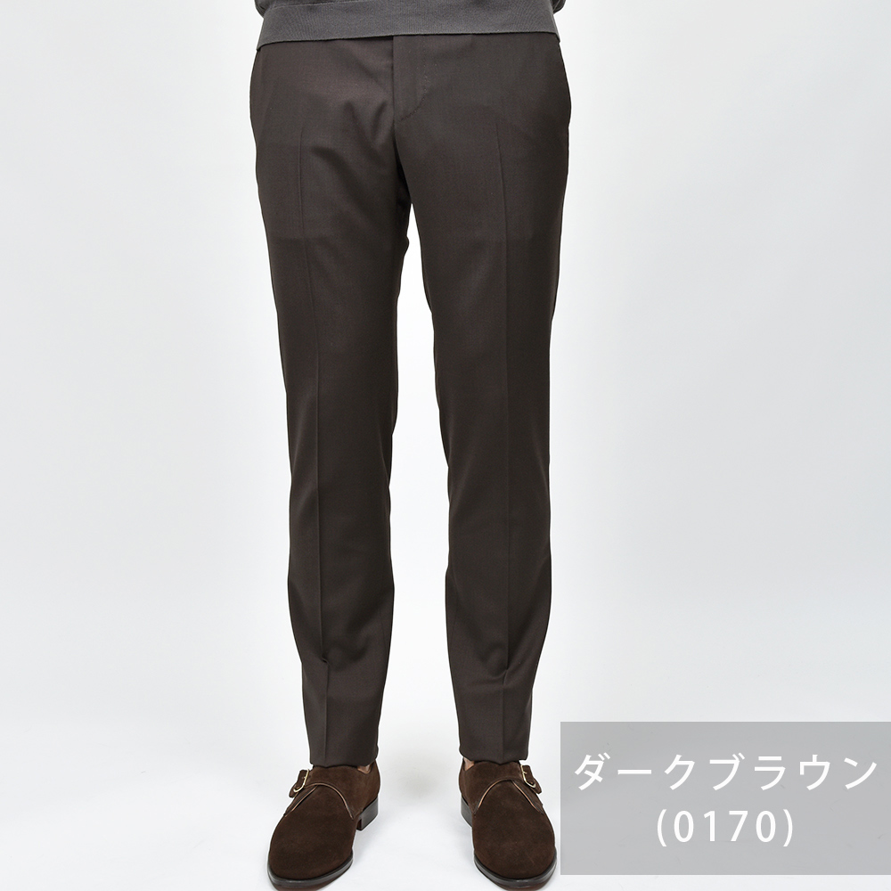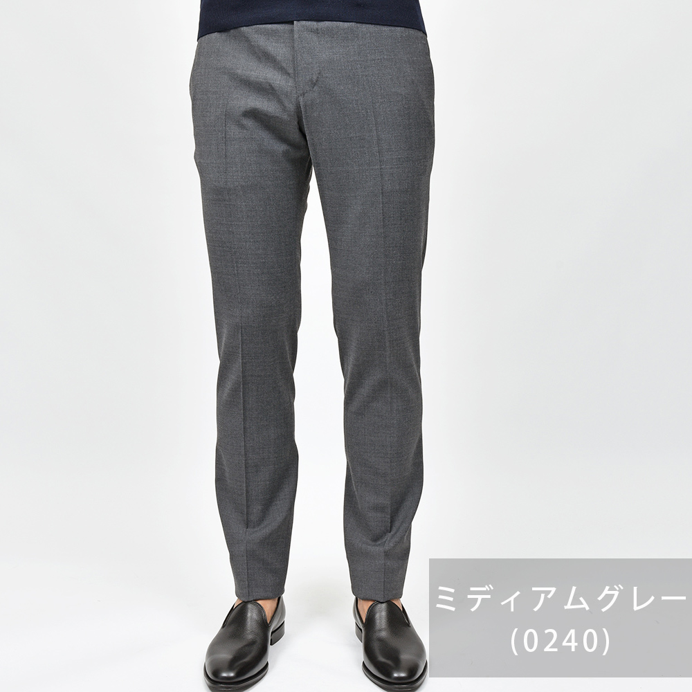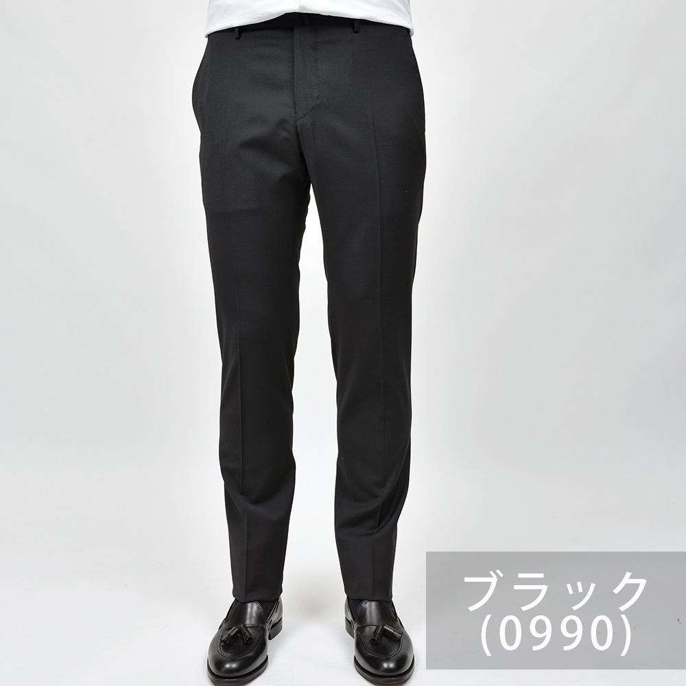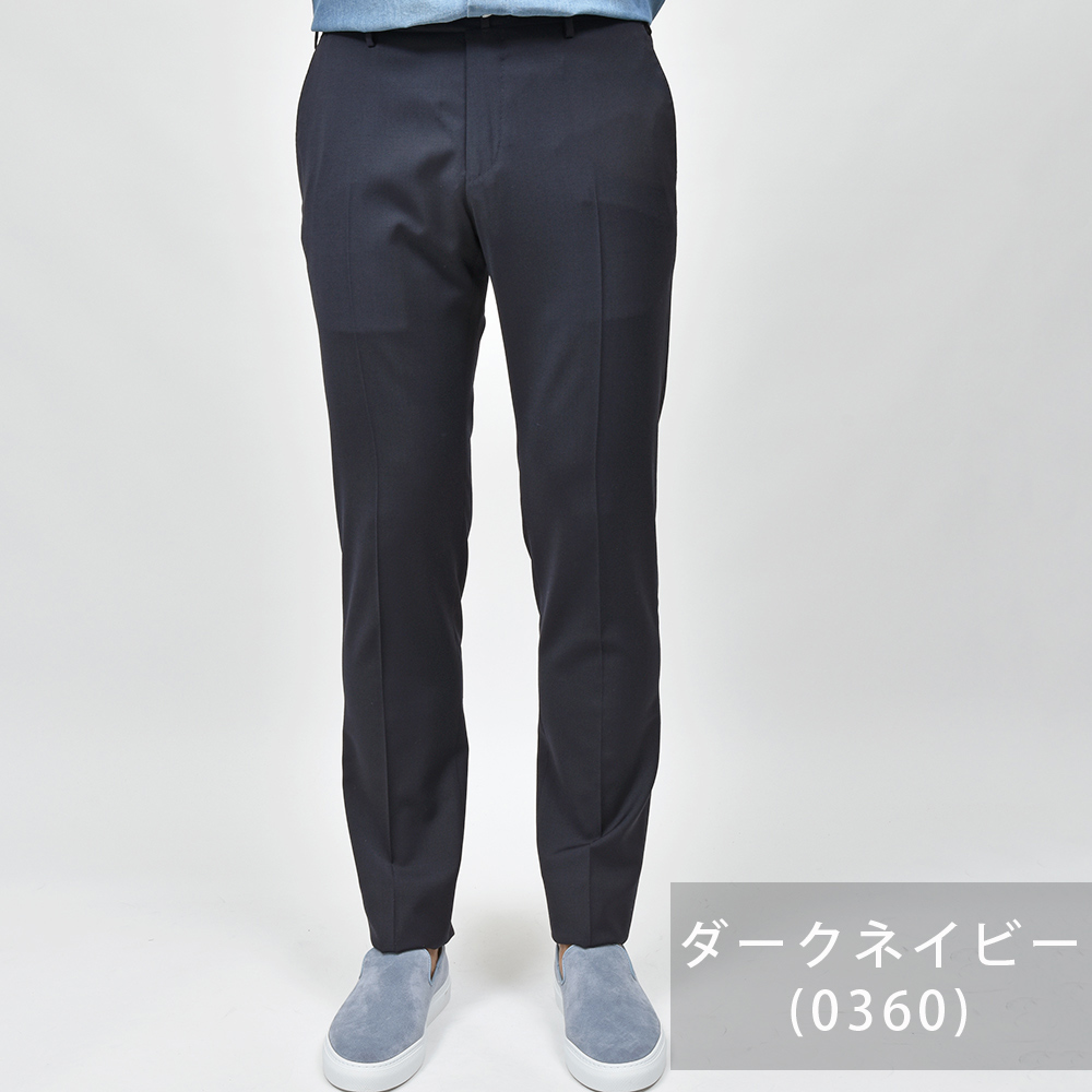 サイズ50がジャストサイズです。ウエストからヒップ・ワタリにかけてややタイトなフィッティングです。裾にかけてテーパードしたスリムなシルエットです。定番のドレスウールパンツ、ノープリーツならこちらです!