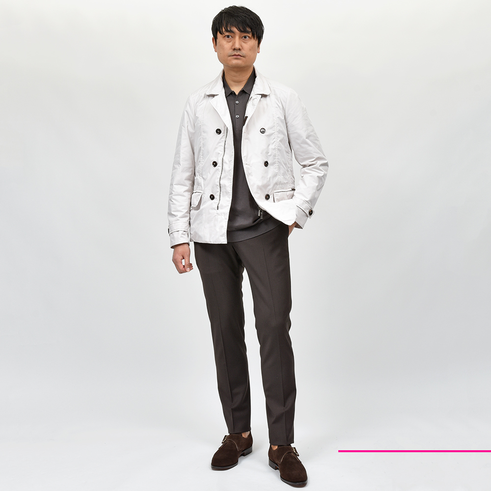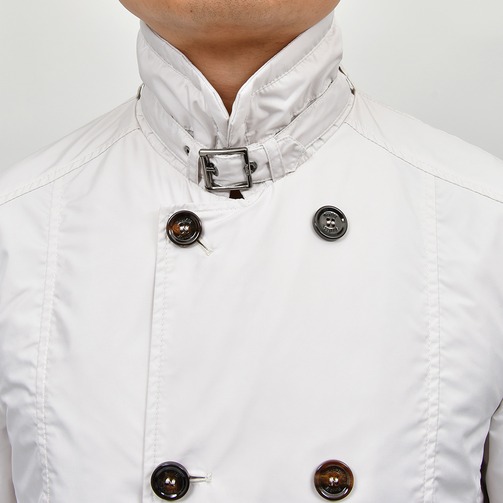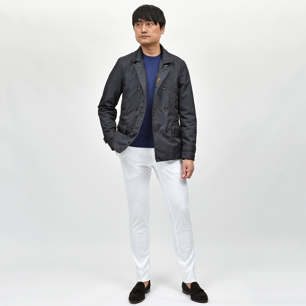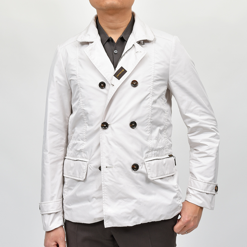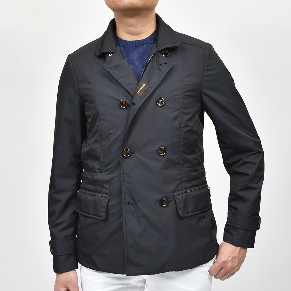 中わた入りのモデル“NABUCCO(ナブッコ)”は、腰ポケットのフラップを表に出すことでジャケットのような雰囲気でも着ることのできる、MooRERで人気の定番モデル。程よいスリムシルエットにウエスト部分のドローコードを絞ることで、シルエットにも遊びが効きます。人気のセミダブルブレスト仕様は、エレガントさが否が応でも香り立つ大人な表情。ライトアウターは春のみならず、秋にも着れる汎用性がありますので長いシーズン着用いただけます。また、“SHAPE MEMORY”を採用したKMは、形状安定ポリエステル生地に撥水加工を施し、シワや汚れの付着を防ぎます。