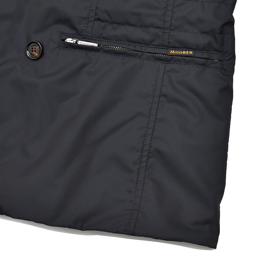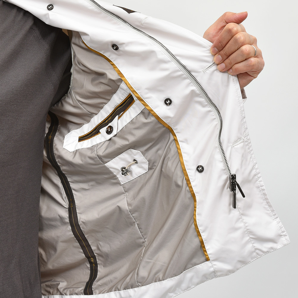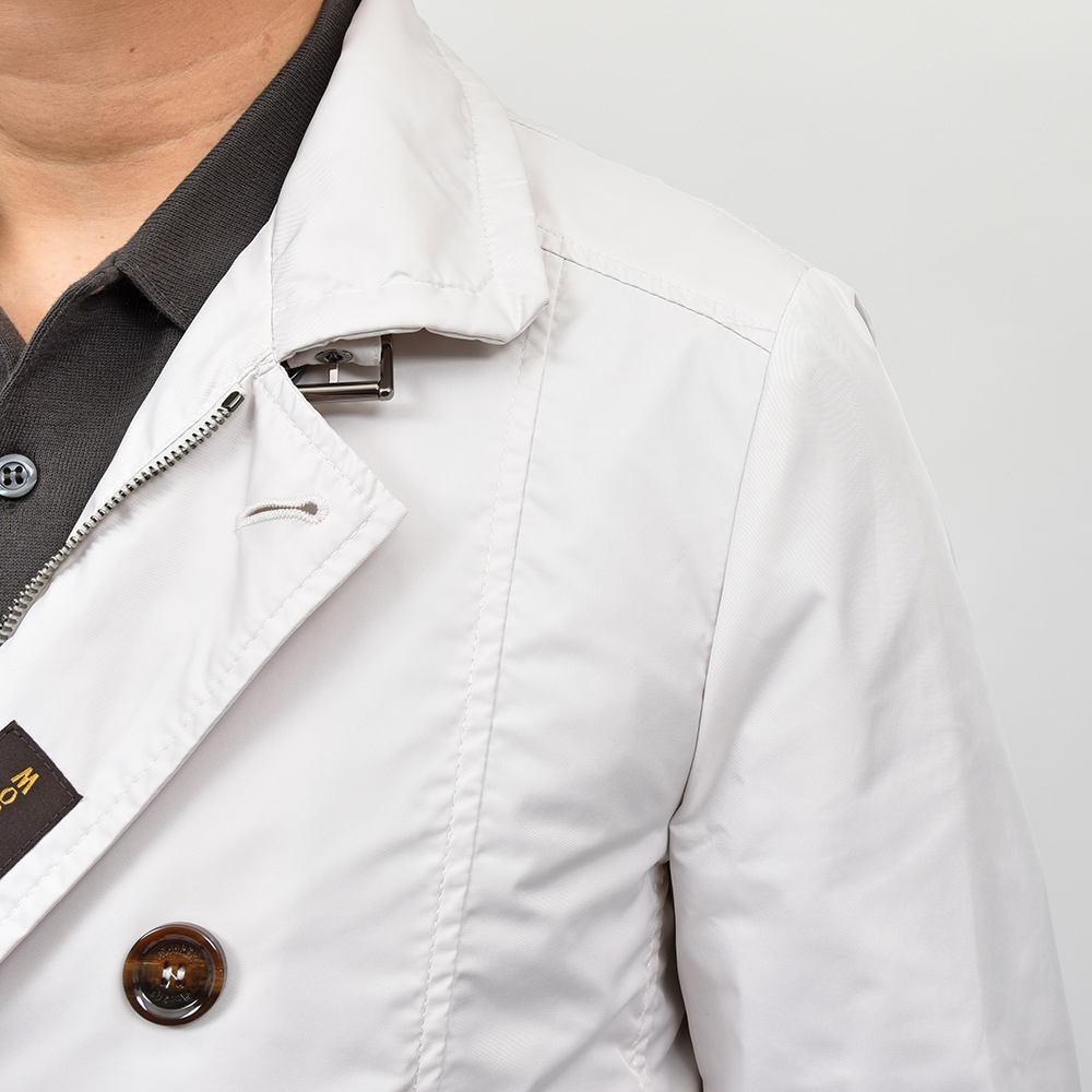 特注のスナップボタン、ファスナーやホーン釦などの拘りに、裏地のナイロン素材の美しさ加えてパイピング処理を施した丁寧な仕上げ。MooRERのアウターに死角はありません。