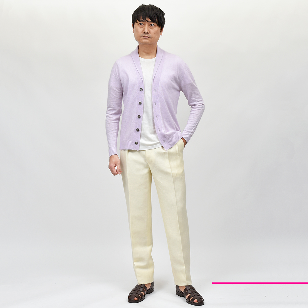 Settefili Cashmereを代表するファブリックの一つである、リネン×コットン素材を使用したこちら。リネンの程よいツヤ感を持ちながらも柔らかく、コットンの質感が強い物になります。地肌に着てもリネン特有のザラザラした感触は皆無。シンプルな着こなしであっても、Settefili Cashmereらしい上品まムードを醸し出してくれます。