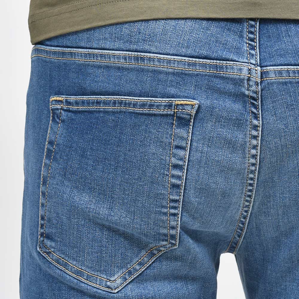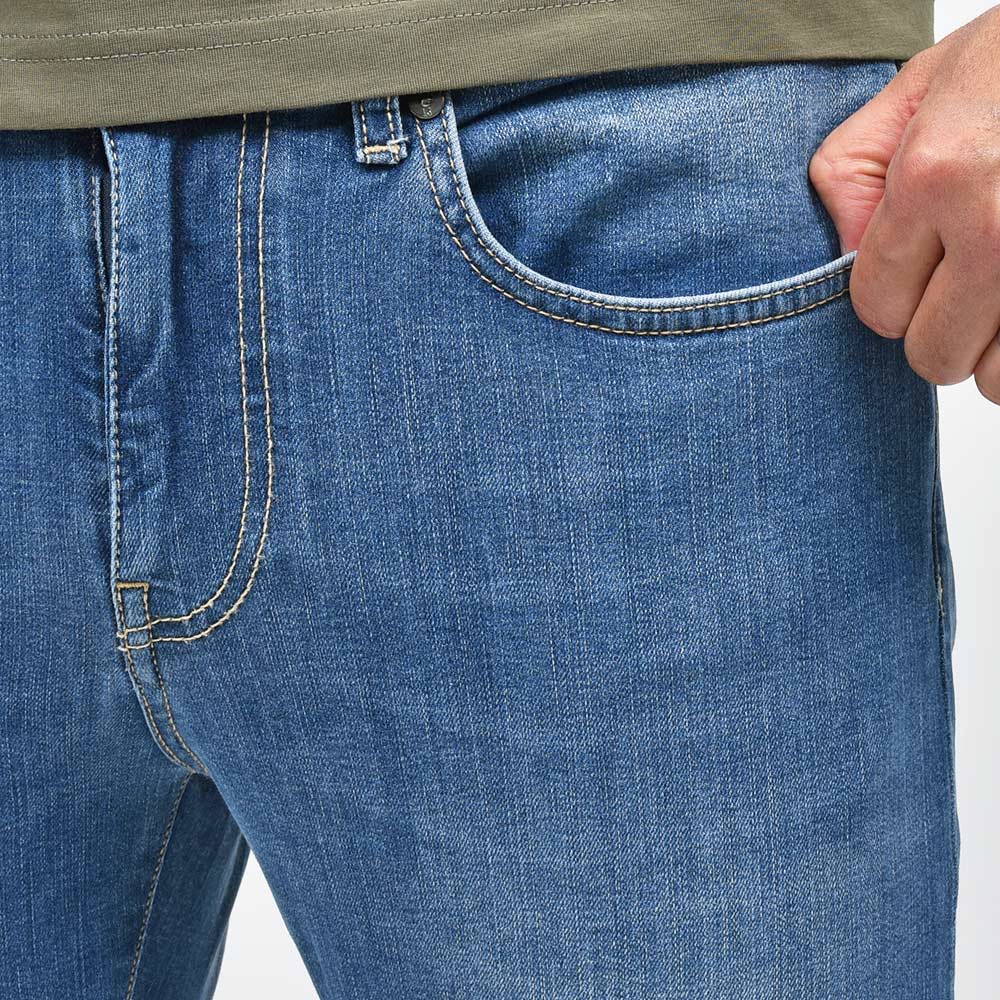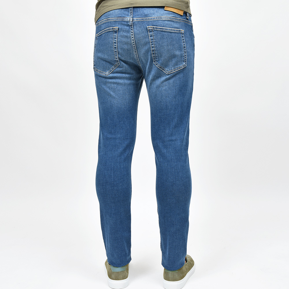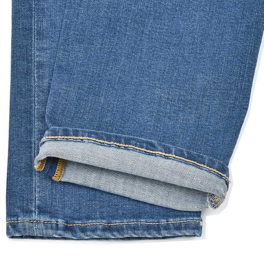 ウォッシュド加工を施したインディゴデニムは、スタイリングを選ばない非常に使い勝手の良いブルーの色味が普遍的な魅力を放っています。また、ストレッチを効かせたコットン主体のファブリックは、言わずもがなの穿き心地。シルバーのボタン&リベットに、ベージュ色のステッチ使いは上品な佇まい。さらに高級感のあるスエードの革パッチが大人の色気を演出してくれます。