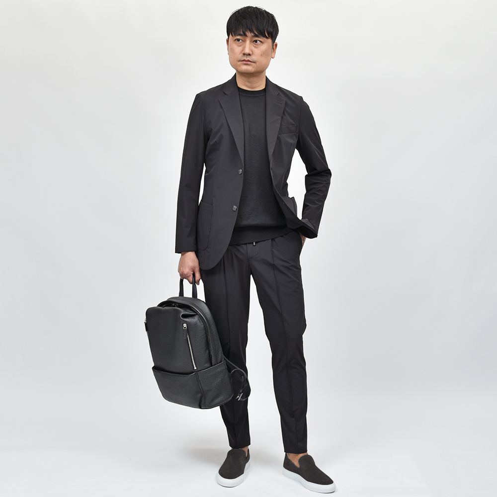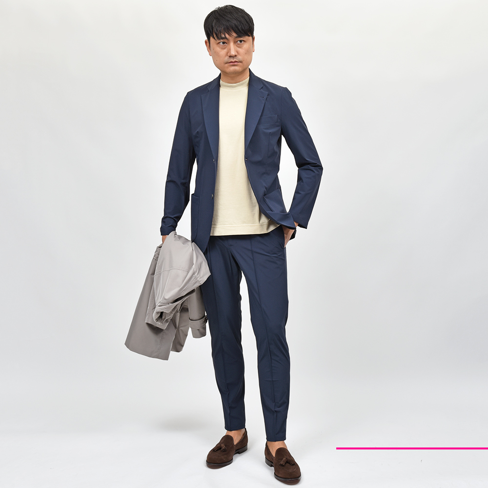 スポーティーな印象が強いナイロン素材ですが、こちらのシャカヌメであればセットアップで着用しても程よくキチンと見えるので非常に頼りになる一着です。