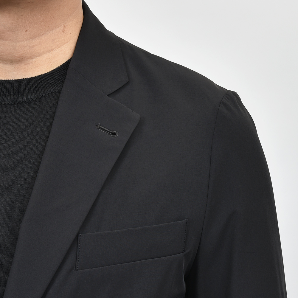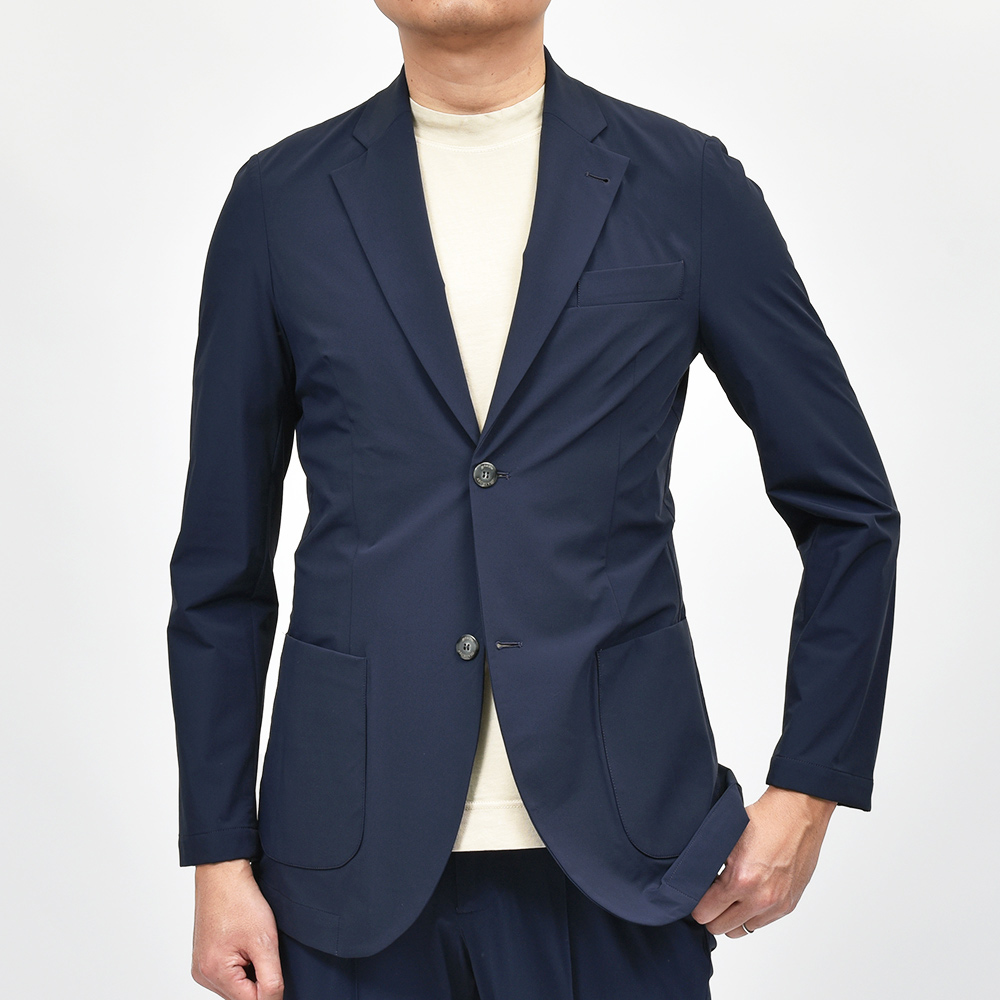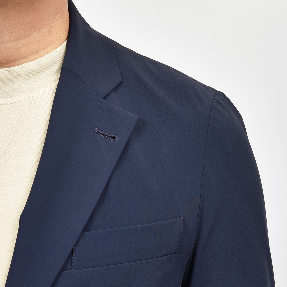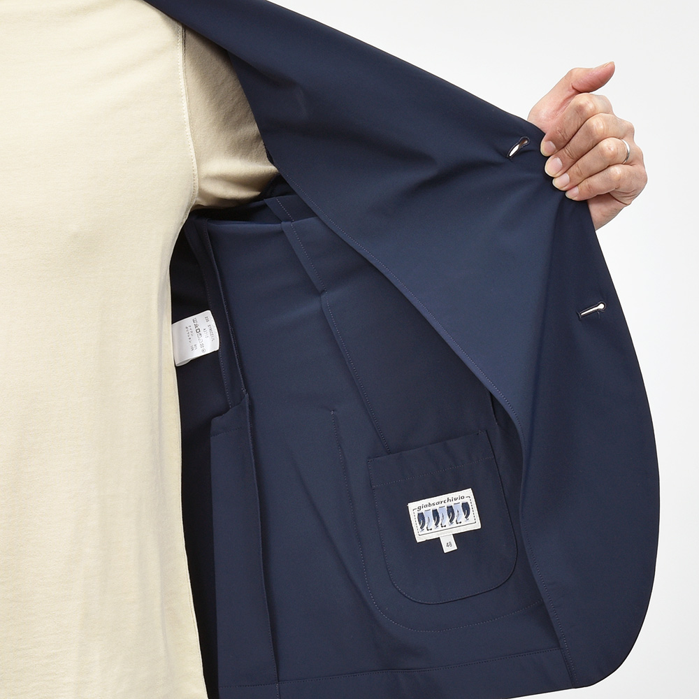giab's ARCHIVIOのジャケットラインのモデル“STROZZI(ストロッツィ)”。イージーなパンツを得意とするブランドですので、ドレスライクなジャケットではなく、アンコンで裏地もない筒袖仕上げで、あくまでも気軽に羽織れる仕上がりとなっています。しかしながら、現代の実情を見ているとこのくらいのジャケットで十分というシーンはよくある事ですので、デザイナーの中新井氏らしい痒い所に手が届く一品です。