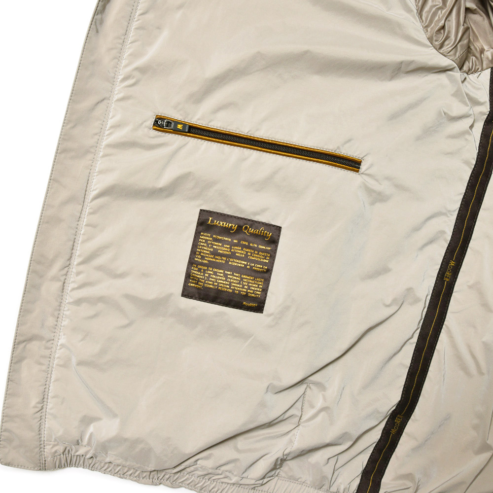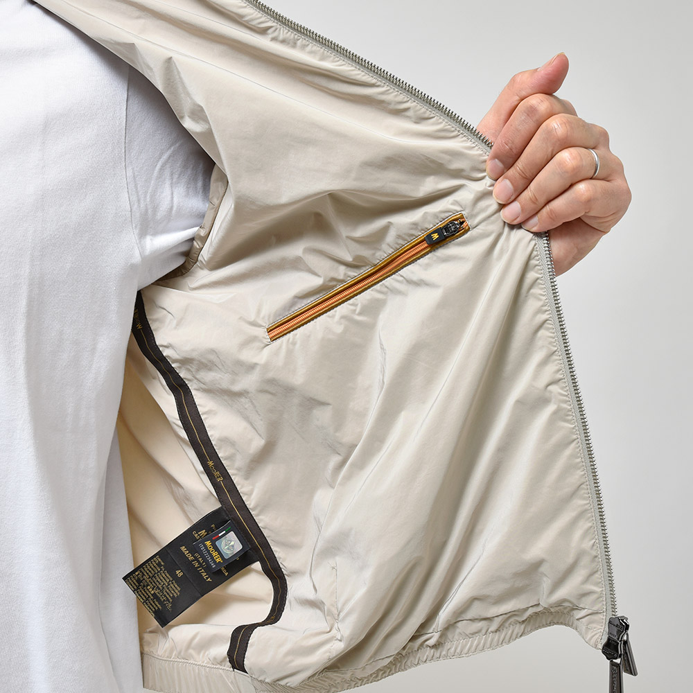特注のスナップボタン、ファスナーやホーン釦などの拘りに、裏地のナイロン素材の美しさ加えてパイピング処理を施した丁寧な仕上げ。MooRER(ムーレー)のアウターに死角はありません。