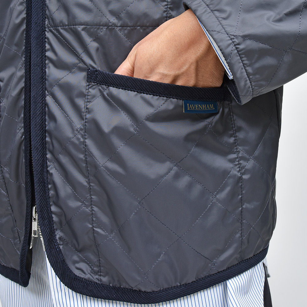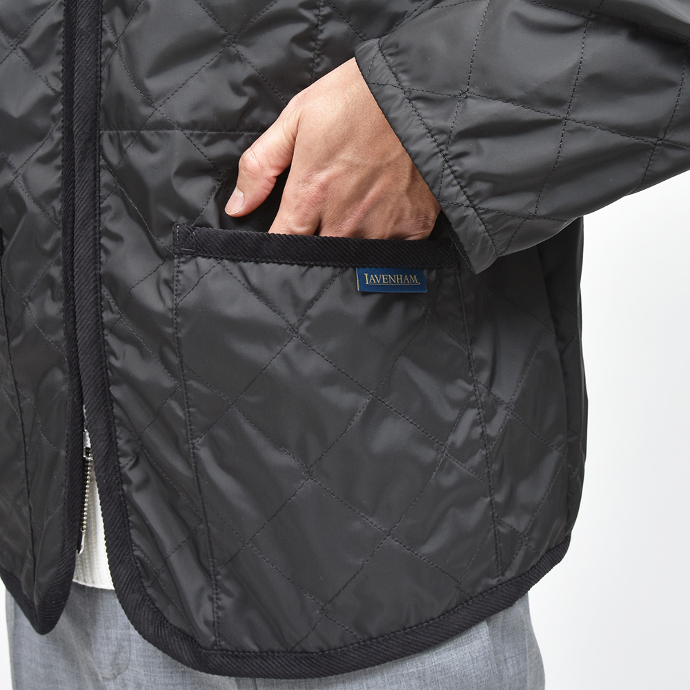 100%リサイクルポリエステルを使用した弱撥水の“ラブンスター”生地を、LAVENHAMの代名詞とも言える“2インチダイヤモンドキルティング”で仕上げた盤石の仕様。耐久性の向上のために施されたオーガニックコットンのコーデュロイバインディングなど、現在でもすべての商品をサフォーク州サドバリーの自社工場で製造する品質管理の徹底ぶりによって、キルティングジャケットといえばLAVENHAMという確固たる地位を築いています。