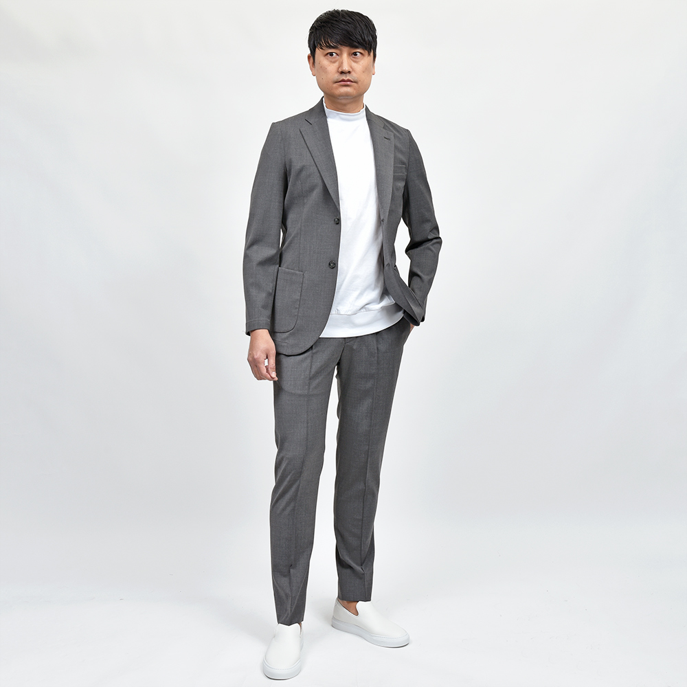 スタンダードジャージーに並ぶ、ココンチの定番ファブリックの一つである“テクノウール”。秋冬のテクノウールは目の細かなツイル織りですが、こちらの春夏用は目付け250gのウールトロピカルで、目付自体も少し軽いものになっています。薄手で軽くドライなタッチはそのままに、上品な表情でありながらも自宅で洗濯が可能なウォッシャブル生地。また、シワにもなりにくく、ストレッチ性に富んだコンフォートなオリジナルファブリックになります。オフはもちろん、オンタイムでも活躍できる抜群の汎用性を発揮してくれます。