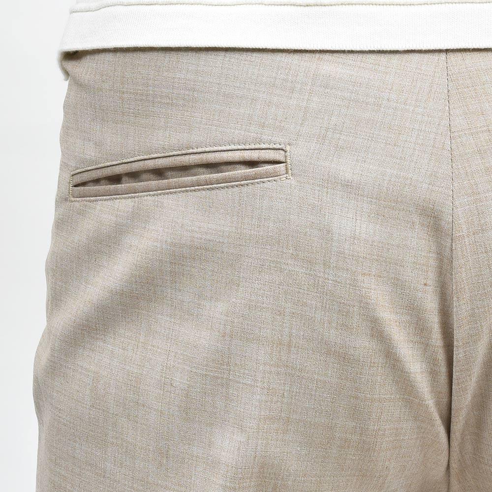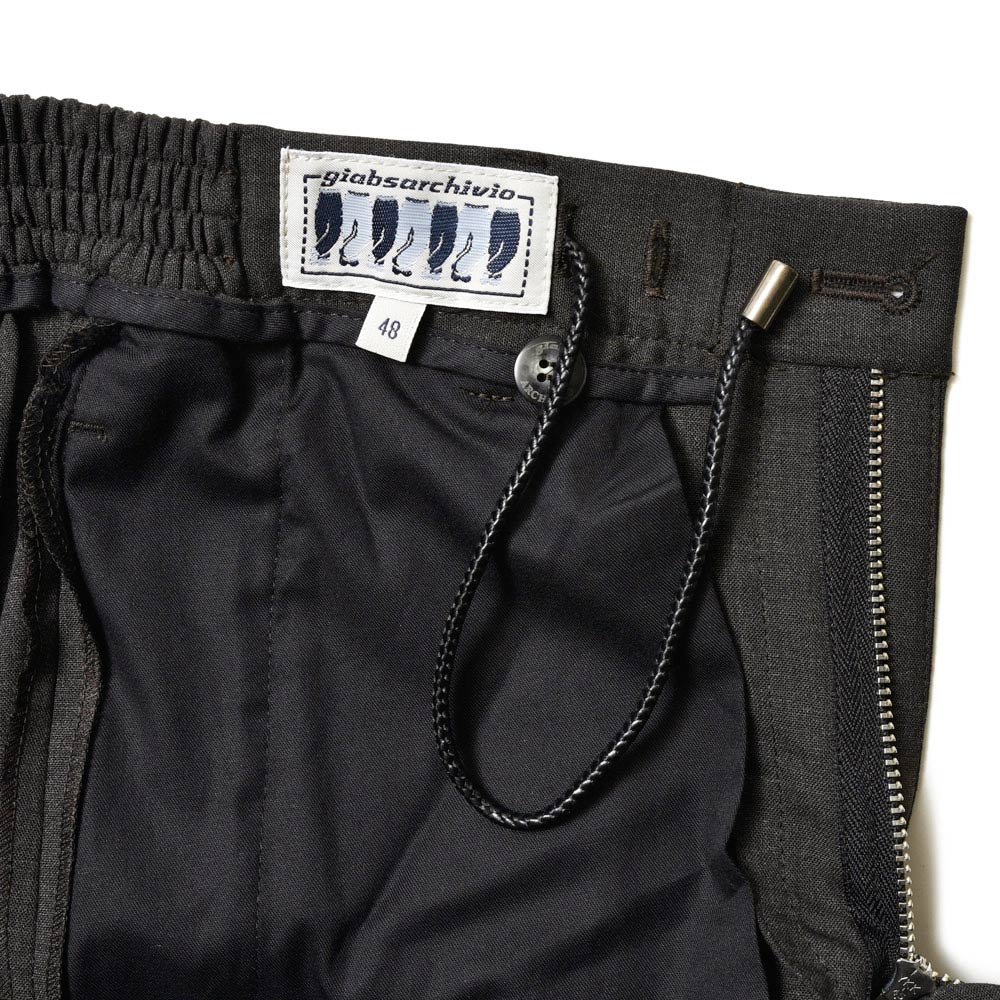 giab's ARCHIVIOを語る上で外せないアイコンモデルの“MASACCIO(マサッチョ)”。リラックスパンツであっても、スリムテーパードの美しいシルエット。さらには、フロントクリースをステッチで抑えることで、美しいラインがいつまでも続く永遠を約束された特別な一本です。ウエストのサイドにはゴムが入っており、ウエストは4cmほど伸縮してくれるリラックスした穿き心地。ドローコードは内側に隠すことができるため、ベルトを巻くとビジネスにも対応する、リラック顔にもドレス顔にも変化の効く万能なアイテムです。