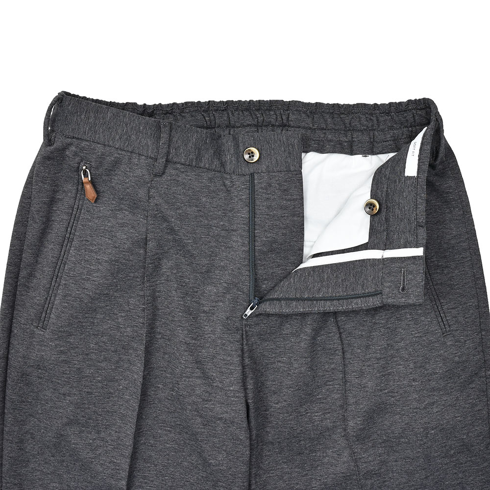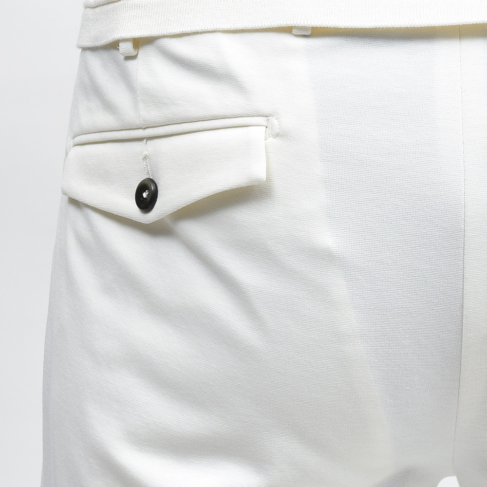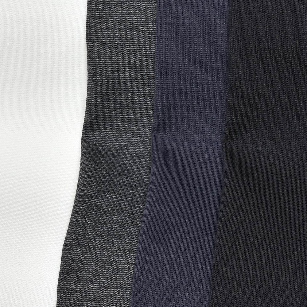 目付け340gと春夏シーズンに向けたライトウエイトなジャージー素材は、残暑の厳しい秋口までの3シーズンで着用できる生地感です。また、大人のためのリラックスパンツを謳う“SOFT FIT”ですので、リラックスした雰囲気を高めてくれるジャージー素材は好相性。程よく艶のある上品な質感のジャージーですので、ラフなジャケットと合わせてもすんなりと馴染んでくれます。