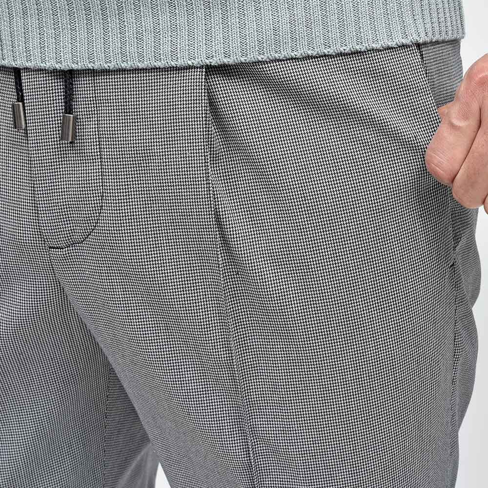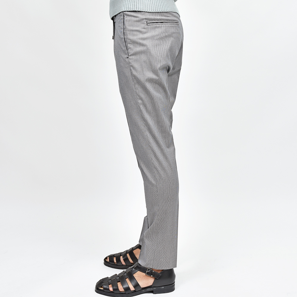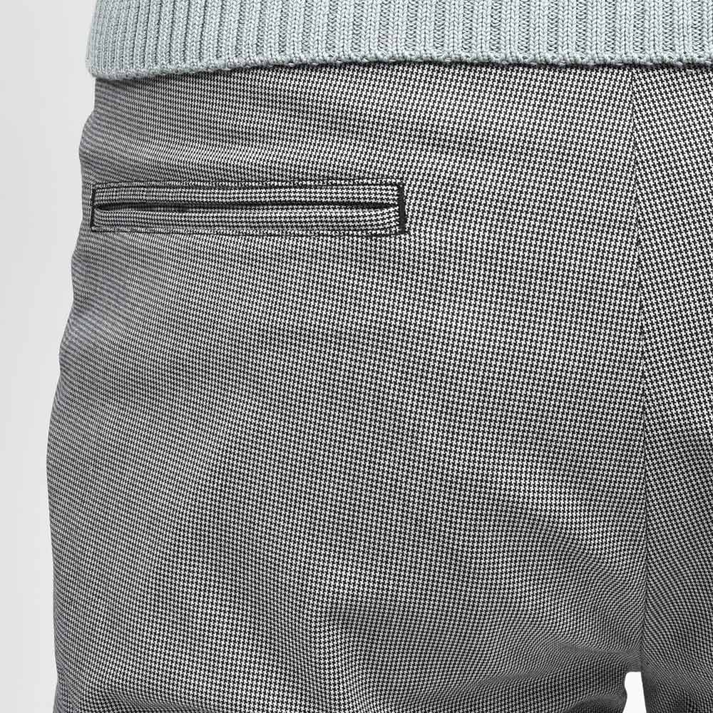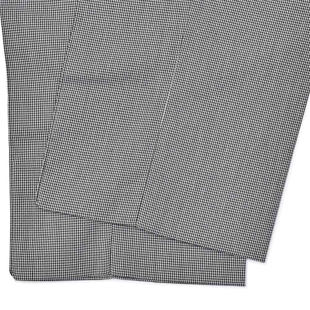今シーズン新登場した“TECH BIRDS”は、目付け280gのかなり薄手でハリのある生地感になります。ライトグレー×ブラックのカラーを使用した、マイクロハウンドトゥースがモダンな雰囲気。また、程よいストレッチ性に、同色系統を使用したハウンドトゥースがシンプルなスタイリングになりがちな季節に華を添えてくれます。