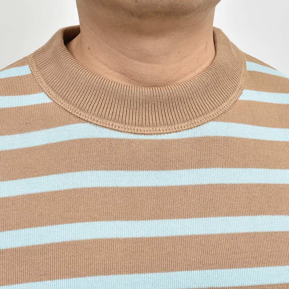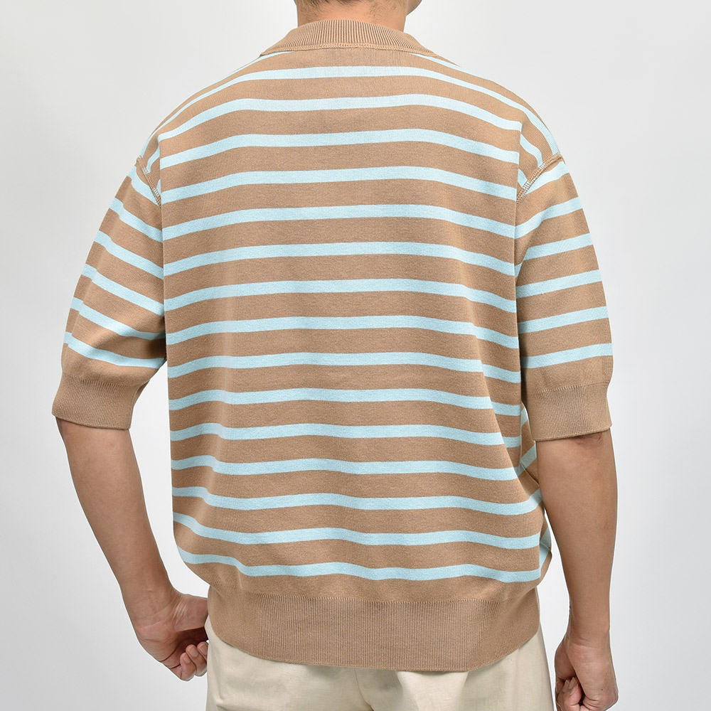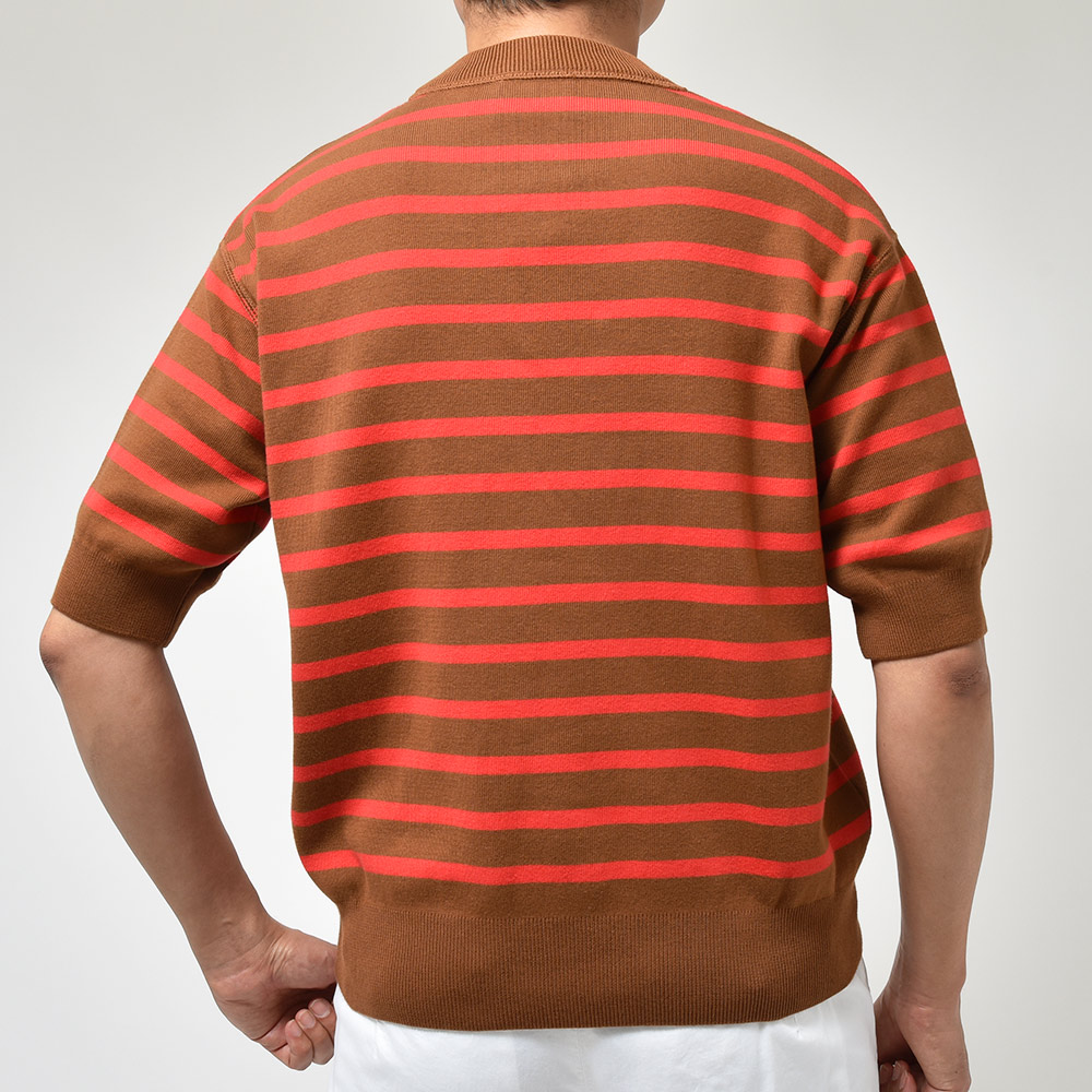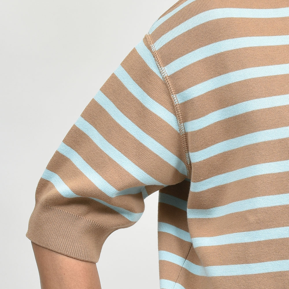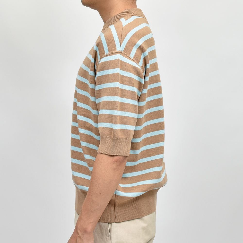 こちらのショートスリーブニット“HUGO”は、ドロップショルダーにたっぷりとゆとりを持った身頃というシルエットでありながらも、野暮ったくなくどこかモダンな香りを漂わせます。裾と袖口のリブ仕様によって、リブの上に生まれるたわみすらもデザインの一つと感じる高い完成度。目の詰まった型崩れしにくい編み地に、滑らかでモッチリとした肉厚のニット素材。伝統あるニットブランドの技術力と、小山氏のデイザインが融合した一品です。
