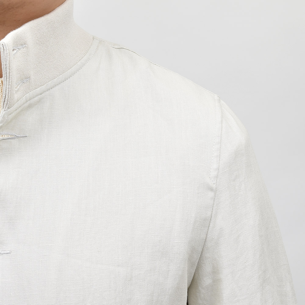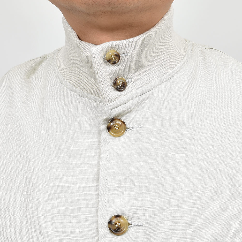 こちらは、程よいコシはありつつも薄手で柔らかなタッチに、控えめな光沢感のリネン素材を使用。清涼感あるリネン素材に、裏地を省いた軽量な仕立てなので非常に快適な着用感をもたらせてくれます。リネン素材特有の清涼感ある着心地ですので春先は勿論、暑い時期にカットソー一枚では寂しいという時にも助けになってくれる一品です。