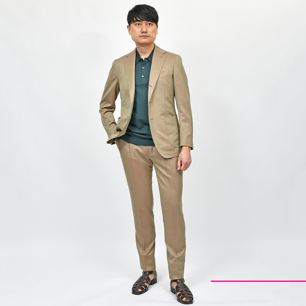 サイズ48がジャストサイズです。ジャケットはタイトすぎず、緩すぎずちょうどいいサイジングです。それでいてスッキリとしています。パンツは股上が気持ち深く、裾にかけて緩やかにテーパードしたクラシックな印象です。春夏らしい王道のソラーロスーツです!
