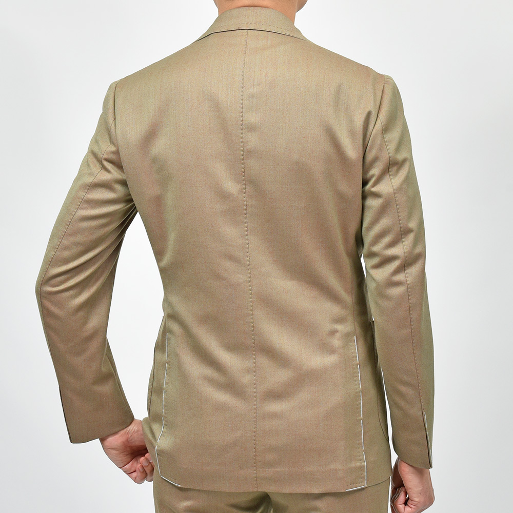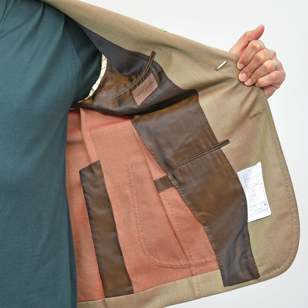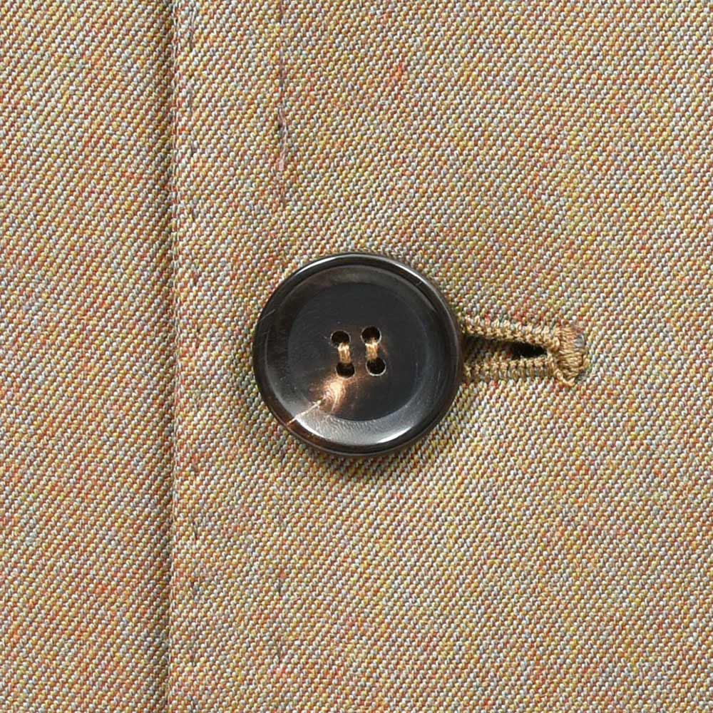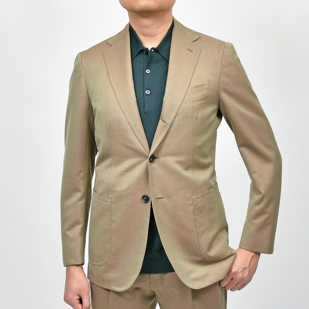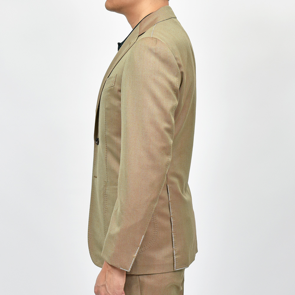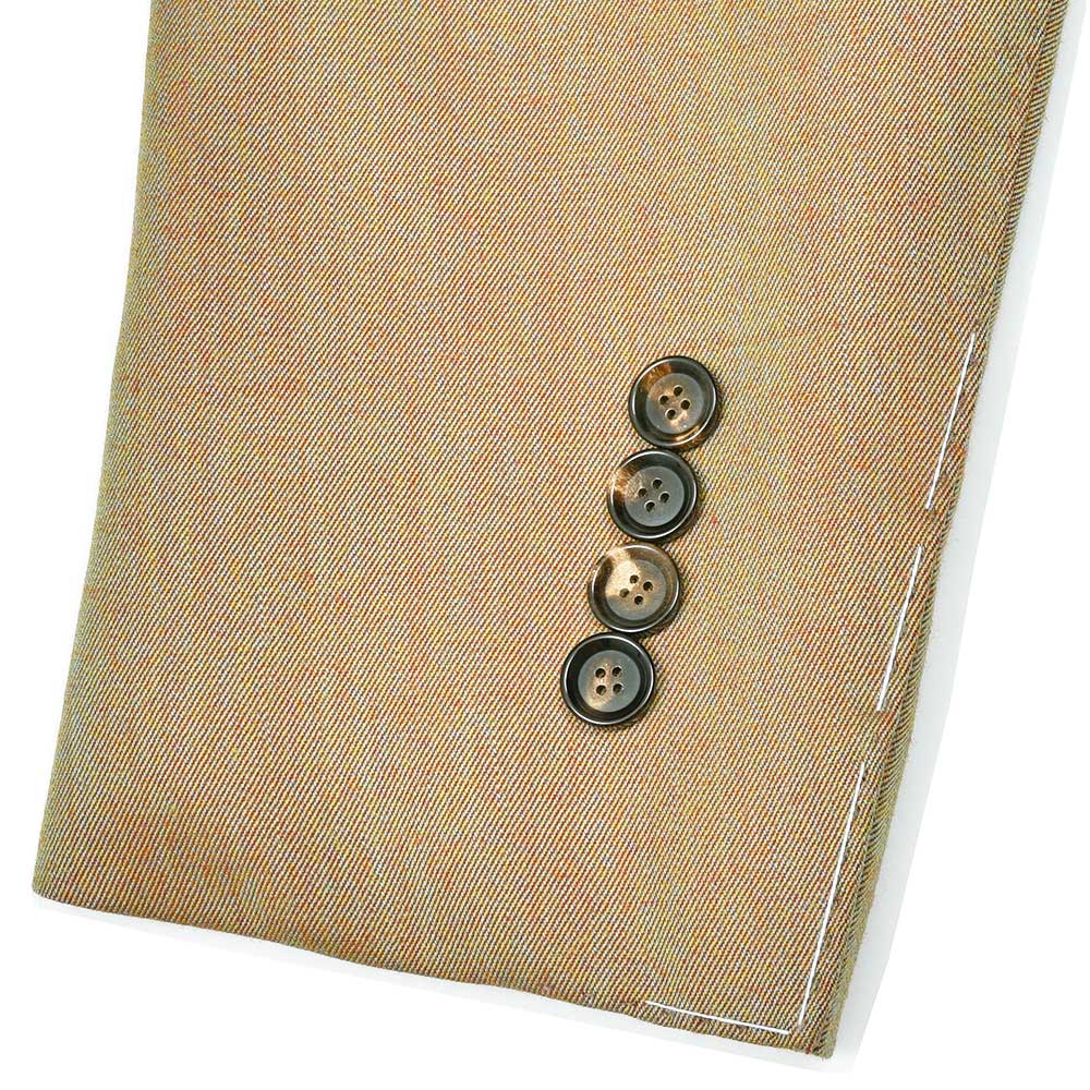 オレンジ×オリーブのソラーロは、目付230gの非常にライトな生地感。ウールにコットンを混紡することで、ウールらしいハリと、コットンのしなやかさが合わさった実用性の高い一着です。春夏限定と思われるソラーロですが、春から気温の高い秋口まで着用することができるため、実は3シーズンにわたって着用することができます。