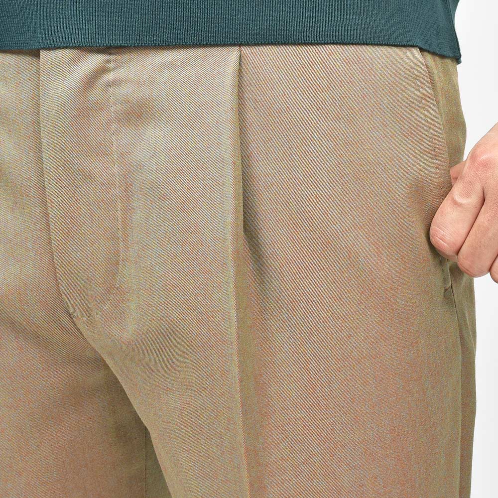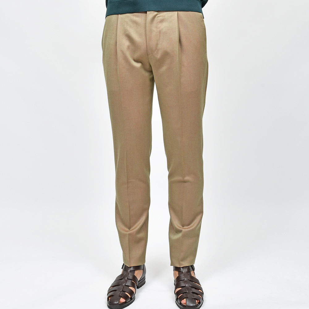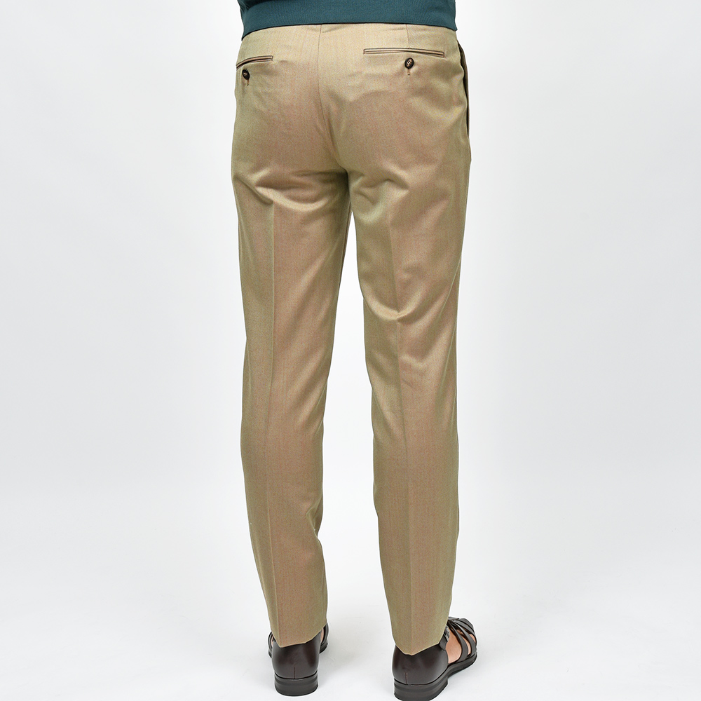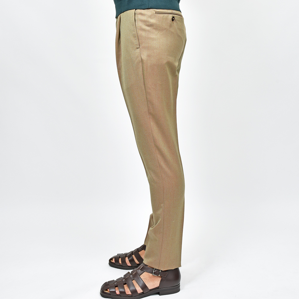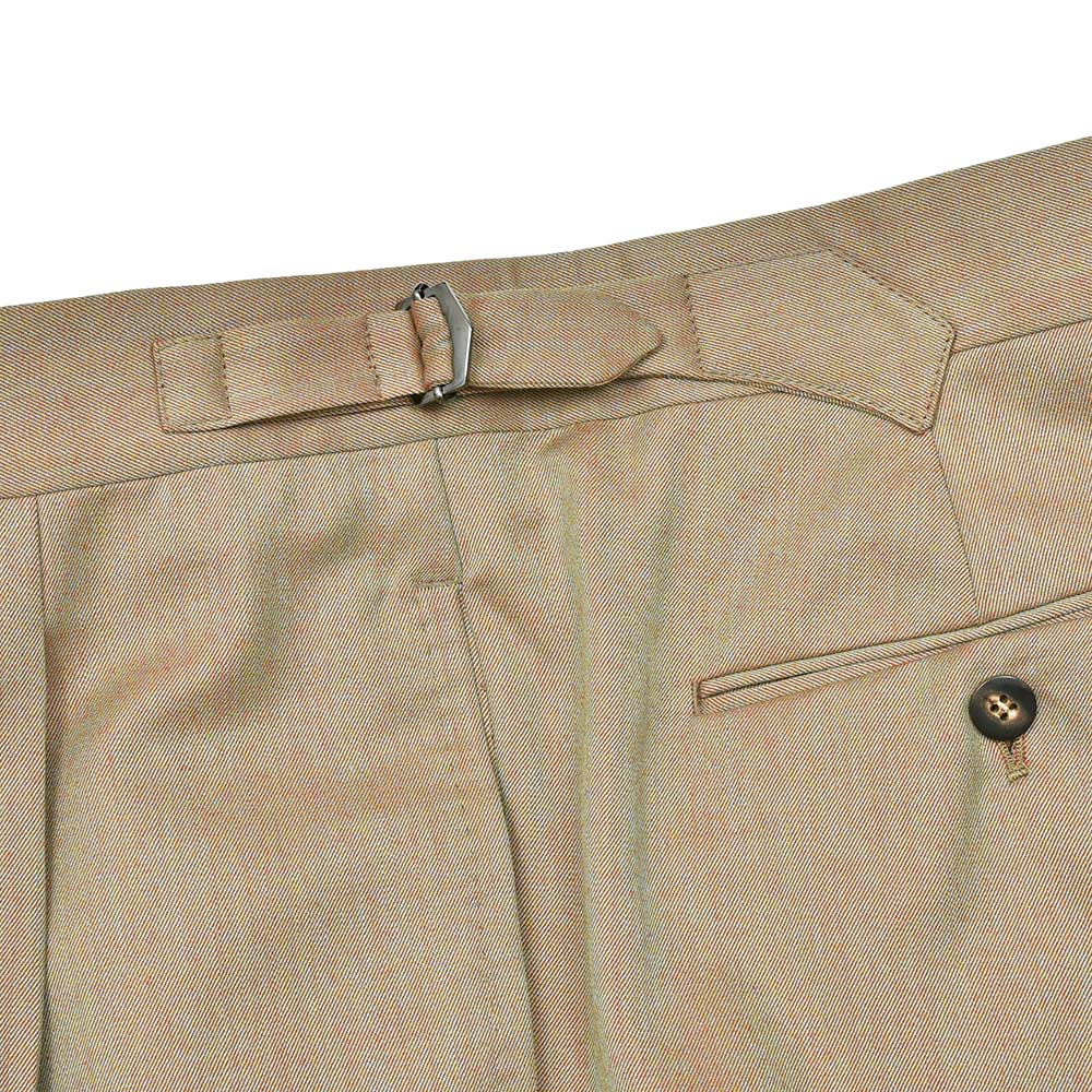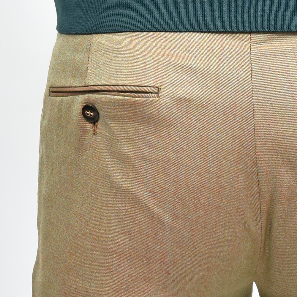 オレンジ×オリーブのソラーロは、目付230gの非常にライトな生地感。ウールにコットンを混紡することで、ウールらしいハリと、コットンのしなやかさが合わさった実用性の高い一着です。春夏限定と思われるソラーロですが、春から気温の高い秋口まで着用することができるため、実は3シーズンにわたって着用することができます。