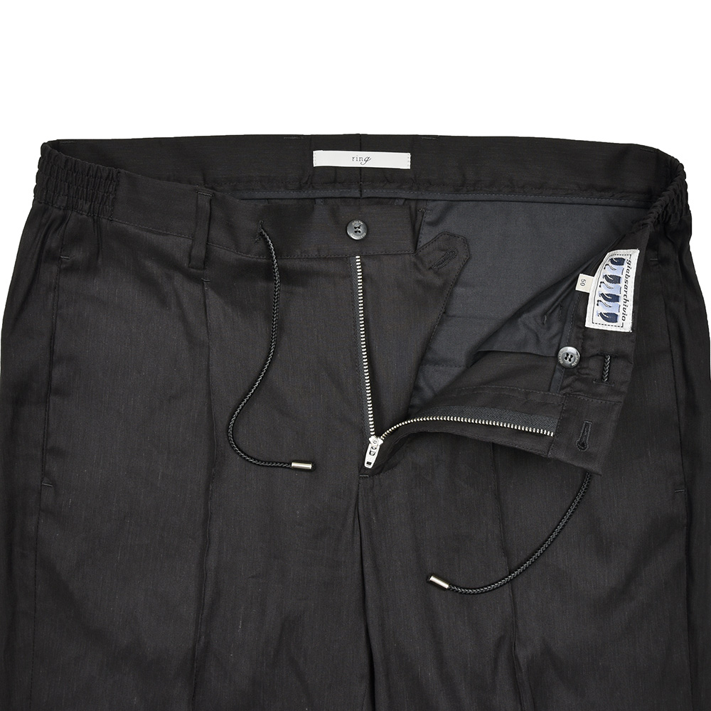 爆発的ヒットを記録したring初となるgiab's ARCHIVIO×ringの別注品、その名も“ring”。モデル名を決めかねていたバイヤー陣に対して、デザイナーの中新井氏の鶴の一声により決定した感慨深い一品です。そして、2020SSシーズンから“ring”をさらにアップデートした“ring2”が登場。1プリーツ入り“MASACCIO”のベースはそのままに、ドローコードをラグジュアリーな雰囲気が漂うイントレチャートに変更。さらに、マーベルトを-0.5cm幅を狭め、股上は+0.5cm深くすることでリラックス感が増しています。膝幅+0.5cmとそれぞれハーフサイズアップし、ふくらはぎの突っ張りを軽減しました。