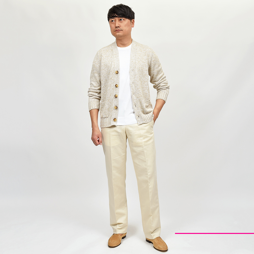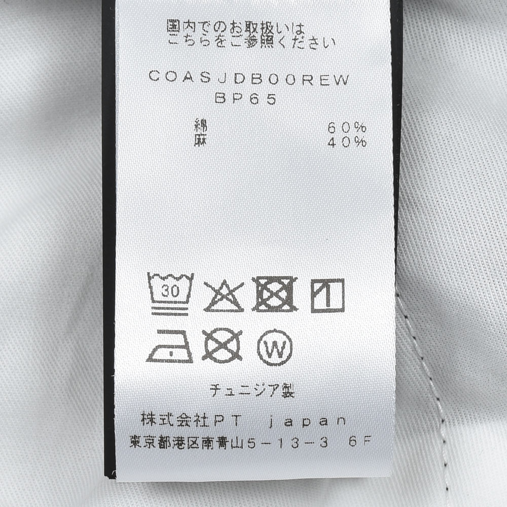 目付け270gとやや薄手のコットン×リネン素材を使用したギャバジンは、コットンの柔らかさにリネンの清涼感が合わさっています。また、リネン素材特有の節が所々にみられることで無地ですが表情のある佇まいとなっています。